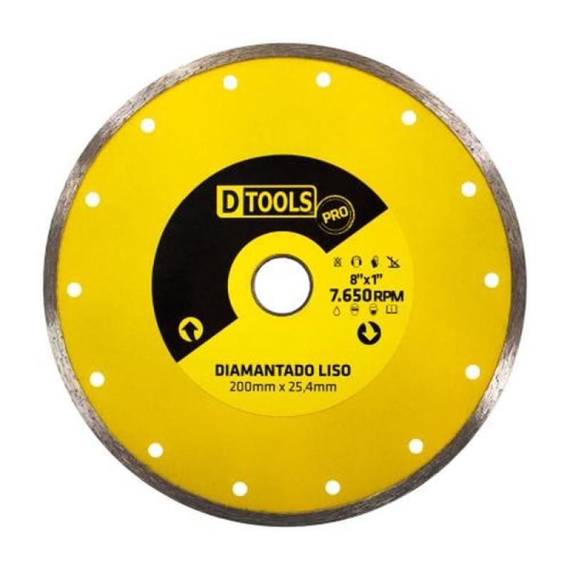Disco Diamantado 8'' Furo 25,4mm para Cortar Pisos e Azulejos - DTOOLS - DISCO DIAMANTADO LISO PRO 8'' FURO 25,4MM - DTOOLSCom o Disco Diamantado Liso Pro 8'' Furo 25,4mm da DTOOLS, você terá em mãos a ferramenta ideal para cortar pisos, azulejos, porcelanatos e mármores com precisão e eficiência. Seu furo de 25,4mm garante um encaixe perfeito em diversas máquinas, proporcionando um corte limpo e sem rebarbas.Desenvolvido para oferecer o melhor rendimento, este disco diamantado da DTOOLS conta com a tecnologia necessária para garantir rapidez nos trabalhos, reduzindo a sobrecarga da máquina e proporcionando um resultado impecável. Além disso, para garantir a durabilidade e eficácia do disco, é recomendado o uso de água na refrigeração durante o corte.- Furo com 25,4mm- Utilizado para cortar pisos, azulejos, porcelanatos e mármores- Recomendado o uso de água na refrigeração para melhor rendimento- Acompanha bucha de redução para ø 22mm- Rapidez em trabalhos com menor sobrecarga da máquinaAdquira agora o Disco Diamantado Liso Pro 8'' Furo 25,4mm da DTOOLS e tenha em mãos a qualidade e eficiência que você precisa para seus projetos de corte. Conte com a marca DTOOLS Universo do Lar para garantir a excelência em suas ferramentas. -------- Descrição Original enviada pelo Fornecedor: DISCO DIAMANTADO LISO PRO 8'' FURO 25,4MM - DTOOLSFuro com 25,4mmUtilizado para cortar pisos, azulejos, porcelanatos e mármoresPara melhor rendimento do disco, usar água na refrigeraçãoAcompanha bucha de redução para ø 22mm.Rapidez em trabalhos - menor sobrecarga da máquina Características Gerais do Produto: Garantia: • 3 meses
