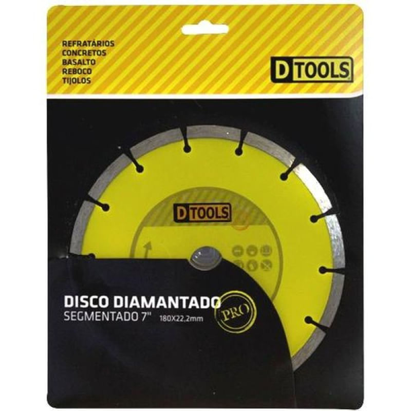 Disco Diamantado Segmentado 7'' Borda 8mm - DTOOLS - Corte Preciso e Rápido - DISCO DIAMANTADO SEGMENTADO PRO 7'' - DTOOLSO Disco Diamantado Segmentado Pro 7'' da DTOOLS é a escolha ideal para quem busca qualidade e eficiência em cortes precisos. Com uma borda de 8mm, este disco proporciona maior produtividade e economia, além de uma vida útil prolongada. Sua maior precisão ao corte garante resultados impecáveis, enquanto a rapidez em trabalhos reduz a sobrecarga da máquina, tornando o processo mais eficiente. Versátil, pode ser utilizado tanto em corte seco quanto refrigerado, dependendo da extensão do trabalho.- Borda de 8mm para maior produtividade e economia- Maior vida útil- Maior precisão ao corte- Rapidez em trabalhos, reduzindo a sobrecarga da máquina- Pode ser utilizado em corte seco ou refrigerado, dependendo da extensão do trabalho- 180mm de Circunferência- 22,2mm de FuroESPECIFICAÃÃES TÃCNICAS:- Marca: DTOOLS- Modelo: Disco Diamantado Segmentado Pro 7''- Borda: 8mm- Circunferência: 180mm- Furo: 22,2mmGaranta cortes precisos e eficientes com o Disco Diamantado Segmentado Pro 7'' da DTOOLS Universo do Lar. Qualidade e durabilidade em um único produto! -------- Descrição Original enviada pelo Fornecedor: DISCO DIAMANTADO SEGMENTADO PRO 7'' - DTOOLSBorda de 8mm - maior produtividade e economiaMaior vida útilMaior precisão ao corteRapidez em trabalhos - menor sobrecarga da máquinaPode ser utilizado em corte seco ou refrigerado, dependendo da extensão do trabalho180mm de Circunferência22,2mm de Furo Características Gerais do Produto: Garantia: • 3 meses