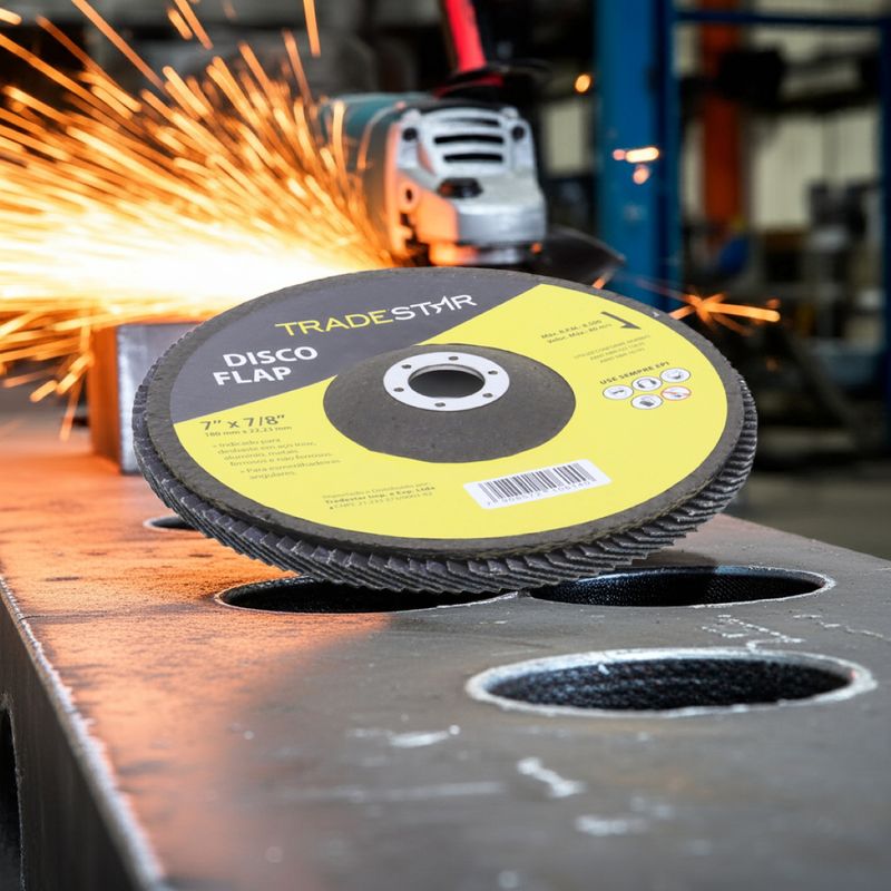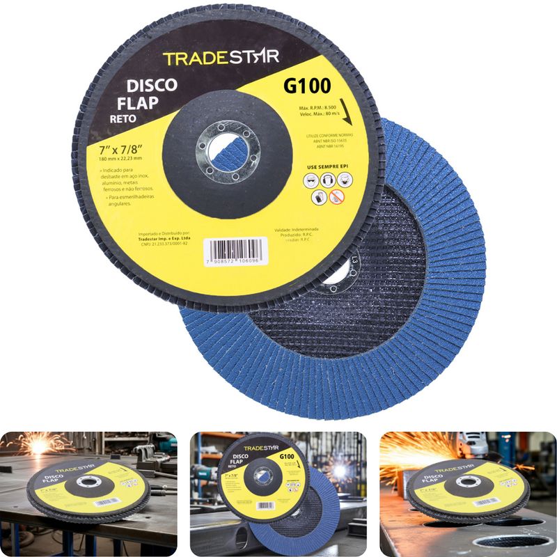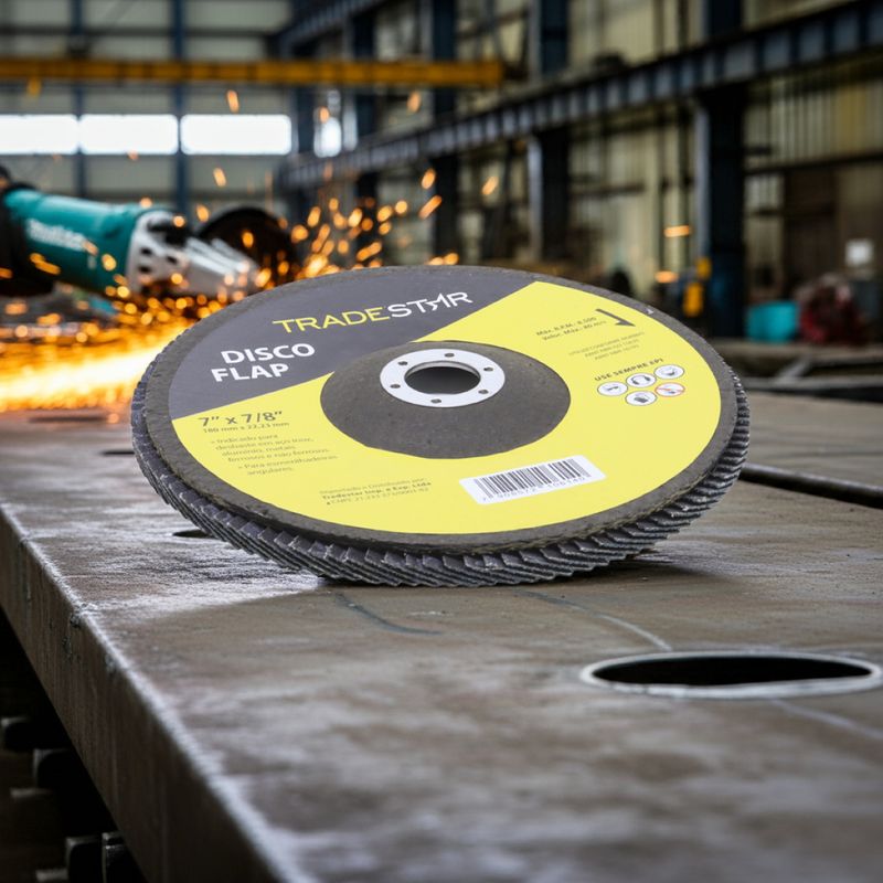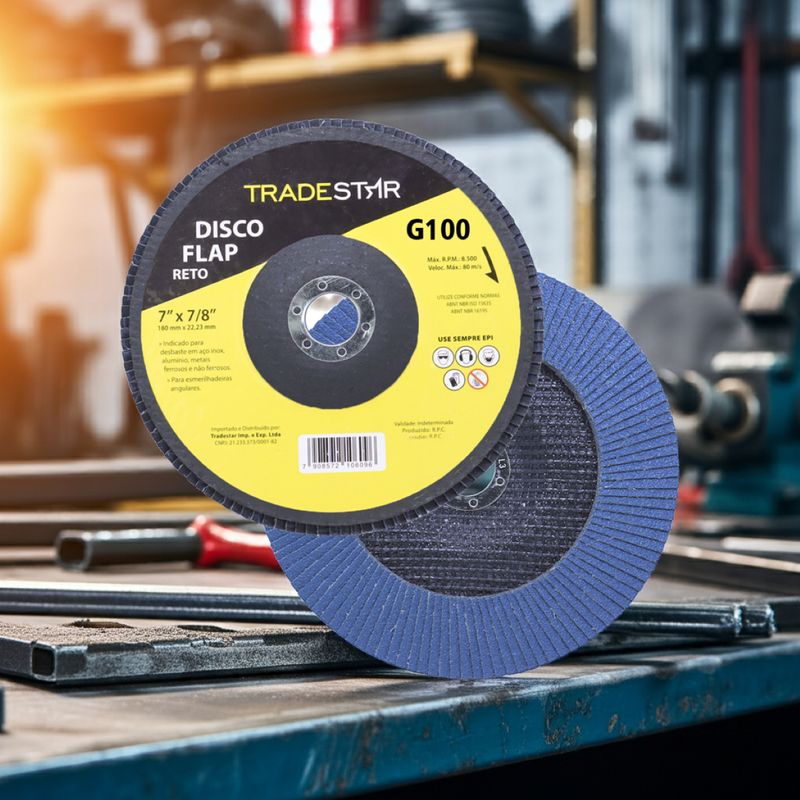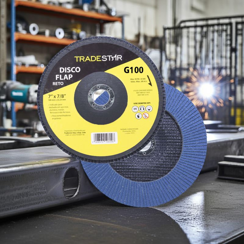 Disco de Desbaste Tradestar 180 mm G100 Fibra Reto Azul Aço e InoxO Disco de Desbaste Tradestar 180 mm G100 Fibra Reto Azul é a escolha ideal para quem busca eficiência, durabilidade e resultados profissionais em trabalhos de desbaste e acabamento em metais. Projetado especialmente para aplicações em aço e inox, este disco flap une qualidade e desempenho, atendendo tanto às necessidades de profissionais do setor industrial quanto de entusiastas do faça-você-mesmo.Sua construção em abrasivo de óxido de alumínio de alta performance garante corte e desbaste precisos, removendo material com rapidez e deixando um acabamento uniforme. O formato reto é ideal para superfícies planas, proporcionando maior estabilidade e controle durante a operação, o que se traduz em trabalhos mais seguros e acabamentos consistentes.O diâmetro de 180 mm (7”) e o furo central de 22,23 mm garantem compatibilidade com a maioria das lixadeiras angulares disponíveis no mercado. Além disso, o suporte de fibra de vidro de alta resistência confere robustez, durabilidade e maior segurança durante o uso, reduzindo riscos de quebra e prolongando a vida útil da ferramenta.Outro destaque é sua capacidade de operação em rotações de até 8.500 RPM, suportando velocidades de até 80 m/s sem comprometer o desempenho ou a segurança do operador. Essa característica faz do Disco Tradestar uma ferramenta confiável tanto para operações intensas quanto para trabalhos mais delicaSeja no ambiente profissional ou em projetos pessoais, o Disco Flap Tradestar 180 mm G100 Fibra Reto Azul Aço e Inox é sinônimo de eficiência e acabamento de qualidade, representando uma excelente relação custo-benefício para quem busca ferramentas abrasivas confiáveis.Especificações- Abrasivo: Óxido de alumínio- Grão: G100- Dimensões: 180 mm- Diâmetro do furo: 22,23 mm- Rotação máxima: 8.500 RPM- Velocidade máxima: 80 m/s- Suporte: Fibra de vidro de alta resistência- Indicação de uso: Desbaste e acabamento de Azul Aço e Inox carbono, Azul Aço e Inox inox, alumínio, metais ferrosos e não ferrososItens inclusos- 1 Flap Disc 180 mm G100 Fibra Fibra Reto Azul Aço e InoxGarantia- 03 meses com o Fabricante