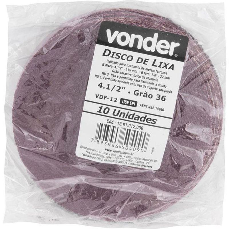 Disco Lixa Fibra 115mm G36 Dvf12 10 Peças - VonderConteúdo da embalagem1 Pacote com 10 discos de lixaAplicações e dicas de usoIndicado para lixamento de metais ferrosos. Utilizado em máquinas angulares rotativas de acionamento elétrico ou pneumático. Aplicações em estruturas metálicas, indústria naval, fundições de metais ferrosos e indústria automobilística.Destaques e diferenciaisPossui costado de fibra que proporciona maior vida útilDETALHES TÉCNICOS Diâmetro do disco de lixa: 4.1/2 - 115 mm Diâmetro do furo do disco de lixa: 7/8 - 22 mm Grão: G 36 Tipo de grão abrasivo: Óxido de alumínio Produto: Disco | Marca: Vonder | Modelo detalhado: Disco lixa fibra 115mm g36 dvf12 10 peças - Vonder | Tipo de discos e rebolos: De desbaste | Número de dentes: 0 | Modelo: 7893946506094 | Diâmetro central: 115mm | Diâmetro do disco de corte: 115mm | É escova: Não | MPN: 7893946506094 | Cor: Amarelo | Tipo de ferramenta: Disco | Código universal de produto: 7893946506094 | É kit: Sim | Grão: G 36
