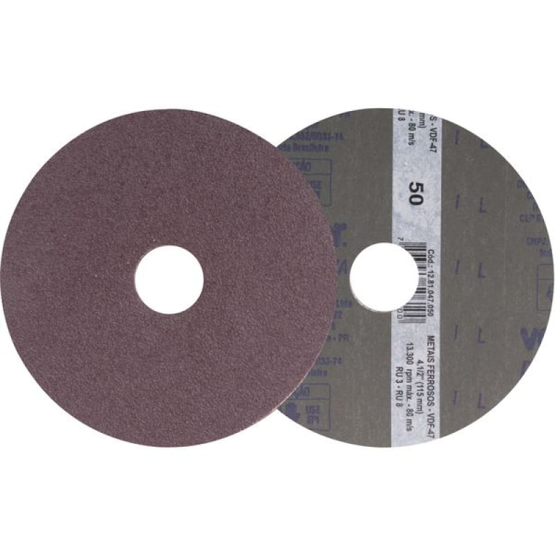 Conteúdo da embalagem1 Pacote com 10 discos de lixaAplicações e dicas de usoIndicado para lixamento de metais ferrosos. Utilizado em máquinas angulares rotativas de acionamento elétrico ou pneumático. Aplicações em estruturas metálicas, indústria naval, fundições de metais ferrosos e indústria automobilística.Destaques e diferenciaisPossui costado de fibra que proporciona maior vida útil DETALHES TÉCNICOS Diâmetro do disco de lixa: 4.1/2" - 115 mm Diâmetro do furo do disco de lixa: 7/8" - 22 mm Grão: G 50 Tipo de grão abrasivo: Óxido de alumínio