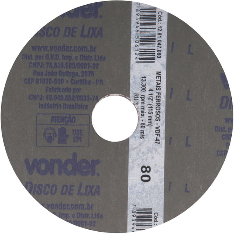 Conteúdo da embalagem1 Pacote com 10 discos de lixaAplicações e dicas de usoIndicado para lixamento de metais ferrosos. Utilizado em máquinas angulares rotativas de acionamento elétrico ou pneumático. Aplicações em estruturas metálicas, indústria naval, fundições de metais ferrosos e indústria automobilística.Destaques e diferenciaisPossui costado de fibra que proporciona maior vida útil DETALHES TÉCNICOS Diâmetro do disco de lixa: 4.1/2" - 115 mm Diâmetro do furo do disco de lixa: 7/8" - 22 mm Grão: G 80 Tipo de grão abrasivo: Óxido de alumínio