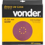 Conteúdo da embalagem1 Pacote com 10 discos de lixaAplicações e dicas de usoIdeal para lixar paredes de alvenaria, gesso e massa corrida. Indicado para Lixadeira de Parede LPV 600 VONDER.Destaques e diferenciaisPossui sistema fixa fácil e 8 furos para aspiração da poeira DETALHES TÉCNICOS Diâmetro do disco de lixa: 225 mm Grão: G 100 Tipo de grão abrasivo: Óxido de alumínio