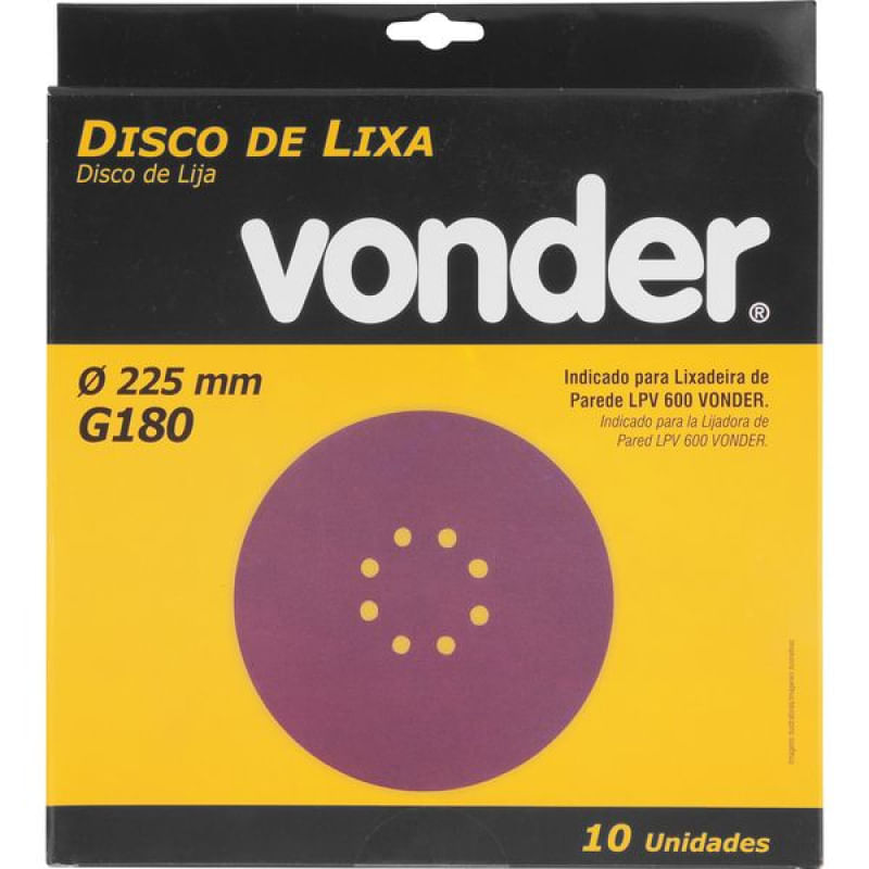 Conteúdo da embalagem1 Pacote com 10 discos de lixaAplicações e dicas de usoIdeal para lixar paredes de alvenaria, gesso e massa corrida. Indicado para Lixadeira de Parede LPV 600 VONDER.Destaques e diferenciaisPossui sistema fixa fácil e 8 furos para aspiração da poeira DETALHES TÉCNICOS Diâmetro do disco de lixa: 225 mm Grão: G 180 Tipo de grão abrasivo: Óxido de alumínio