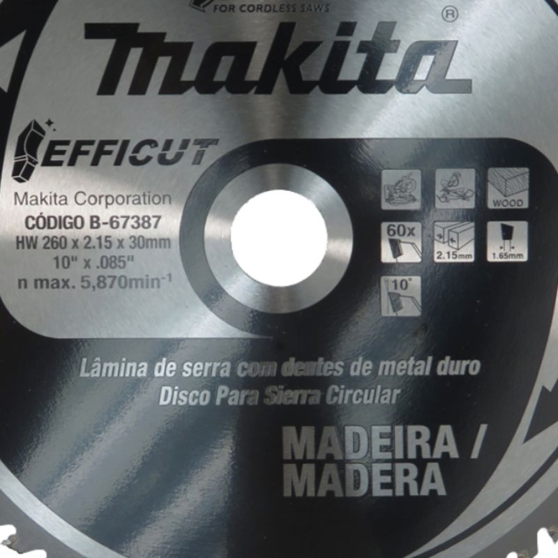 Disco Serra Makita 260 x 30 mm 60 Dentes B-67387Projetado para oferecer desempenho excepcional com serras de esquadria a bateria, o Disco de Serra Makita B-67387 é a ferramenta perfeita para quem busca cortes precisos, rápidos e com acabamento impecável. Com diâmetro de 260 mm, furo de 30 mm e 60 dentes no formato ATAFR, esse disco alia tecnologia e engenharia de ponta para atender com excelência os profissionais da marcenaria e construção civil.Seu grande diferencial está na espessura reduzida do corpo (1,65 mm) e dos dentes (2,15 mm), o que resulta em cortes mais suaves, menor esforço da máquina e redução significativa no consumo de energia, especialmente útil em serras a bateria, onde a autonomia é um fator crítico. Com o uso do B-67387, o profissional consegue trabalhar por mais tempo com uma única carga, mantendo a produtividade e sem abrir mão da qualidade no acabamento.Os 60 dentes de ângulo positivo de 10°, combinados com o formato ATAFR (Alternate Top Alternate Face with Rake), proporcionam cortes extremamente limpos e precisos em madeiras macias ou duras, com menos rebarbas e praticamente sem necessidade de retrabalho. É o tipo de disco que entrega valor real no dia a dia, seja em cortes transversais, esquadrejamentos ou acabamentos finos.Especificações- Diam: 260- Furo: 30- Anel: 25.4/15.88- Espessura do dente: 2,15- Espessura do disco: 1,65- Número de dentes: 60- Ângulo do dente: 10°- Formato do dente: ATAFR- Aplicações: Madeira- Segmentos: Construção Civil / MarcenariaItens inclusos- Disco Serra Makita B-67387Garantia- 03 meses com o Fabricante