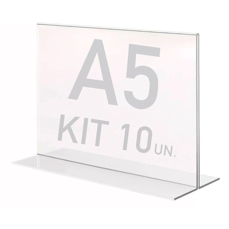 Display Expositor T A5 15x21cm Horizontal Acrílico Ps 10 PçsKit 10 Displays expositor T A5 Horizontal transparente porta papel, podendo usar frente e verso (folha A5). Envio IMEDIATO.Divulgue de forma simples, fácil e eficiente. Os conteúdos podem ser diversos, sendo: Cardápio, Promoção, Aviso, Propaganda, Lembrete, Comunicação da empresa e outros.Modo de uso: mesa, balcão, vitrines, estantes ou outros locais que desejar comunicar.Tamanho A5 T (Horizontal):Altura 15 cm.Largura 21 cm.Profundidade 7 cm.Espessura 2 mm.Contém 10 peças.Material: PS cristal transparente, similar ao acrílico. Qualidade e grande durabilidade.Corte eletrônico, feito com perfeição.Garantia de 3 meses, contra defeitos de fábrica.Recomendações: Limpar apenas com pano úmido.