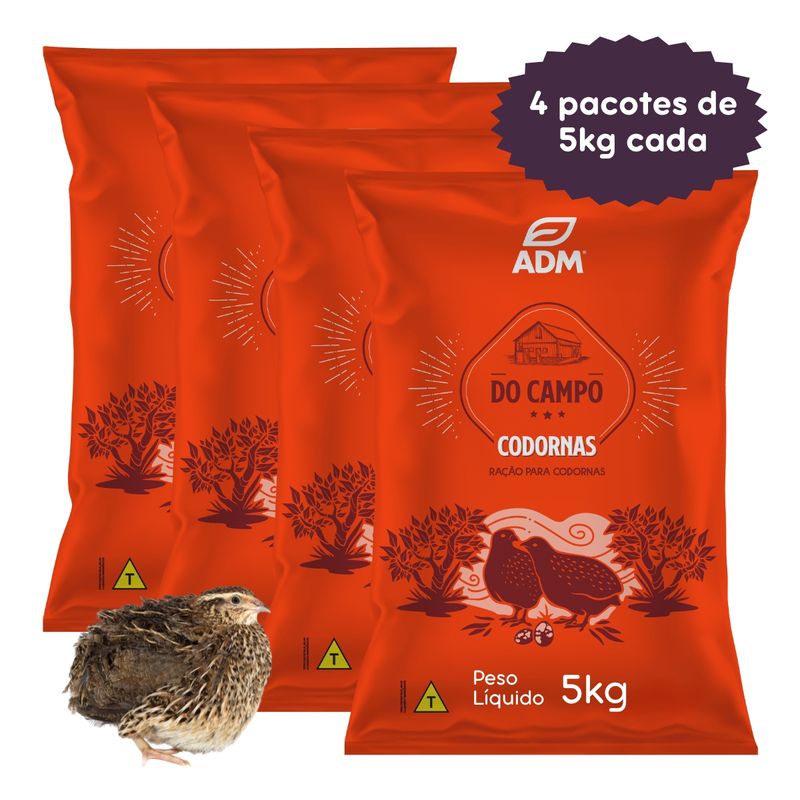 Kit 4 un Ração ADM DO CAMPO Codornas | Ração para Codornas 5kg - 20kg totalRevendedor Autorizado ADM DO CAMPO Codornas é uma ração completa, balanceada e altamente nutritiva, desenvolvida especificamente para codornas em fase de produção. Formulada para atender às exigências nutricionais dessa etapa, contribui para elevada taxa de postura, melhor qualidade e resistência da casca dos ovos, uniformidade produtiva e manutenção da saúde das aves ao longo de todo o ciclo produtivo. Por que usar DO CAMPO CodornasA fase de produção das codornas exige elevados níveis de proteína, energia, cálcio, fósforo, aminoácidos essenciais, vitaminas e minerais, fundamentais para sustentar a postura contínua sem comprometer o desempenho e o bem-estar das aves. DO CAMPO Codornas oferece uma formulação equilibrada, com ingredientes selecionados, minerais, vitaminas, enzimas e probióticos, promovendo melhor digestibilidade, eficiência alimentar e maior longevidade produtiva do plantel. Trata-se de uma solução prática, segura e confiável, indicada tanto para criações domésticas quanto para pequenos e médios produtores. ADM DO CAMPO Codornas é a escolha certa para quem busca regularidade na produção, ovos com melhor qualidade de casca e manejo nutricional eficiente, com a segurança e o padrão técnico de um dos maiores grupos globais em nutrição animal. Descrição do ProdutoMarca: ADMLinha: Do CampoProduto: Do Campo – CodornasCategoria: Ração para CodornasPeso Líquido: 20 kgIndicação: Alimentação de codornas em fase de produção. Composição BásicaMilho moído*, farelo de soja*, farelo de arroz, casca de arroz, farelo de trigo, calcário calcítico, fosfato bicálcico, cloreto de sódio, sulfato de ferro, sulfato de cobre, monóxido de manganês, óxido de zinco, iodato de cálcio, selenito de sódio, sulfato de cobalto, vitamina A, vitamina D3, vitamina E, vitamina K3, vitamina B1, vitamina B2, niacina (ácido nicotínico), D-pantotenato de cálcio, vitamina B6, ácido fólico, biotina, vitamina B12, cloreto de colina, DL-metionina, carvacrol, ácido acético, ácido propiônico, propionato de amônio, aditivo enzimático, aditivo probiótico, BHT (butilhidroxitolueno), BHA (butilhidroxianisol) e etoxiquin. Espécies doadoras do gene: Agrobacterium tumefaciens e/ou Arabidopsis thaliana e/ou Bacillus thuringiensis e/ou Streptomyces hygroscopicus e/ou Streptomyces viridochromogenes e/ou Zea mays. Eventuais SubstitutivosFarelo de girassol, quirera de arroz, triguilho, farelo de gérmen de milho desengordurado*, sorgo integral moído, milho degerminado*, gérmen de milho*, farelo de algodão*. Espécies doadoras do gene: Agrobacterium tumefaciens e/ou Arabidopsis thaliana e/ou Bacillus thuringiensis e/ou Streptomyces hygroscopicus e/ou Streptomyces viridochromogenes e/ou Zea mays. Indicação de UsoRação formulada para a criação de codornas em fase de produção. Modo de UsoFornecer o produto às codornas desde o início até o final da produção. Recomenda-se oferecer de 25 a 30 g por ave ao dia, divididos em duas refeições diárias, em horários regulares. ConservaçãoConservar em local seco e arejado, sobre estrados, afastado de paredes e devidamente embalado. Não armazenar junto a produtos tóxicos. Níveis de Garantia (por kg do produto)Umidade (máx.): 130,00 gProteína Bruta (mín.): 200,00 gExtrato Etéreo (mín.): 30,00 gFibra Bruta (máx.): 80,00 gMatéria Mineral (máx.): 150,00 gCálcio (mín.): 35,00 g / (máx.): 40,00 gFósforo (mín.): 6.000,00 mgSódio (mín.): 1.800,00 mgFerro (mín.): 30,00 mgCobre (mín.): 6,00 mgManganês (mín.): 70,00 mgZinco (mín.): 50,00 mgIodo (mín.): 1,00 mgCobalto (mín.): 0,20 mgSelênio (mín.): 0,30 mgVitamina A (mín.): 12.000,00 UIVitamina D3 (mín.): 2.400,00 UIVitamina E (mín.): 24,00 UIVitamina K3 (mín.): 3,20 mgVitamina B1 (mín.): 2,40 mgVitamina B2 (mín.): 11,20 mgVitamina B3 (mín.): 48,00 mgVitamina B5 (mín.): 18,00 mgVitamina B6 (mín.): 4,00 mgVitamina B9 (mín.): 2,00 mgVitamina H (mín.): 0,12 mgVitamina B12 (mín.): 16,00 mcgColina (mín.): 250,00 mgLisina (mín.): 10,00 gMetionina (mín.): 3.500,00 mgFitase (mín.): 0,50 FTUBacillus subtilis (mín.): 0,10 x 10⁹ UFC Informação RegulatóriaProduto isento de registro no Ministério da Agricultura, Pecuária e Abastecimento, conforme legislação vigente para alimentação animal. Estabelecimento fabricante registrado no MAPA. Indústria Brasileira. OBS: Na quantidade de 20 kg poderão ser enviados 4 sacos de 5 kg ou 1 saco de 20 kg, conforme disponibilidade no momento do pedido.