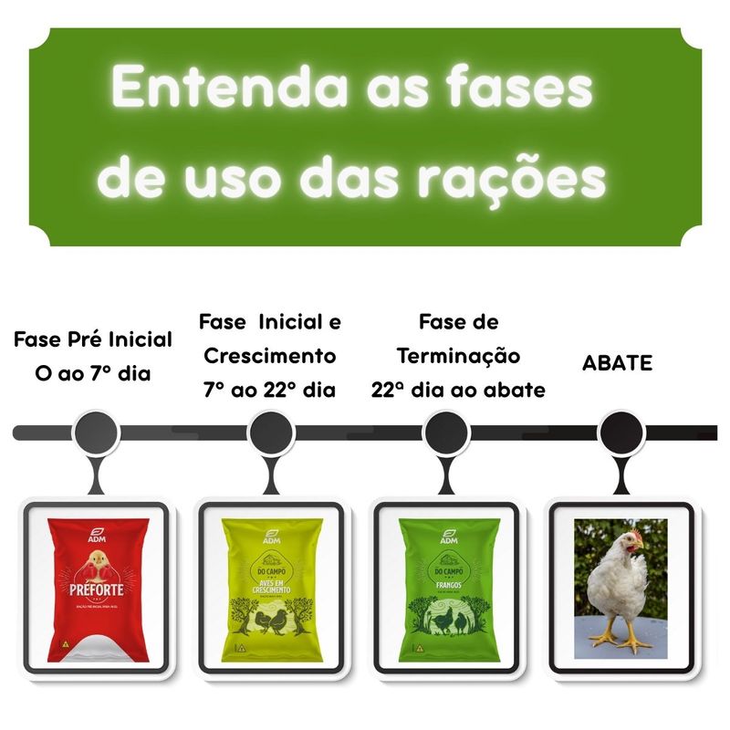 Kit 4 un Ração ADM Do Campo Frangos 5kg - 20kg totalRevendedor Autorizado ADM DO CAMPO FRANGOS é uma ração completa desenvolvida para aves de criação caseira, indicada para as fases de crescimento e engorda. Formulada com ingredientes naturais e selecionados, oferece absorção superior e melhor aproveitamento dos nutrientes, contribuindo para desenvolvimento equilibrado, bom ganho de peso e manutenção da saúde das aves. Por que usar DO CAMPO – FRANGOSA alimentação adequada nas fases de crescimento e engorda é fundamental para garantir desempenho produtivo e aves mais fortes. DO CAMPO FRANGOS combina fontes energéticas, proteicas, vitaminas, minerais, aminoácidos, enzimas e probióticos que favorecem a digestibilidade, melhor conversão alimentar e uniformidade do lote. É uma solução prática para criadores que buscam simplicidade, qualidade nutricional e confiança em uma marca reconhecida. ADM DO CAMPO Frangos é a escolha certa para quem cria aves de forma caseira e deseja um alimento seguro, balanceado e eficiente. Um produto desenvolvido com a tecnologia e o know-how de um dos maiores grupos globais em nutrição animal, garantindo bons resultados ao longo do ciclo produtivo. Descrição do ProdutoMarca: ADMLinha: Do CampoProduto: Do Campo FrangosCategoria: Ração para AvesPeso Líquido: 5 kgIndicação: Alimentação de aves de criação caseira nas fases de crescimento e engorda. Composição BásicaMilho moído*, farelo de glúten de milho*, farelo de soja*, farelo de algodão*, farelo de arroz, casca de arroz, farelo de trigo, calcário calcítico, cloreto de sódio, sulfato de ferro, sulfato de cobre, monóxido de manganês, óxido de zinco, iodato de cálcio, selenito de sódio, sulfato de cobalto, vitamina A, vitamina D3, vitamina E, vitamina K3, vitamina B1, vitamina B2, niacina (ácido nicotínico), D-pantotenato de cálcio, vitamina B6, ácido fólico, biotina, vitamina B12, cloreto de colina, lisina, carvacrol, amarelo tartrazina, aditivo probiótico, aditivo enzimático, ácido acético, ácido propiônico, propionato de amônio, BHT (butilhidroxitolueno), BHA (butilhidroxianisol), etoxiquin. Espécies doadoras do gene: Agrobacterium tumefaciens e/ou Arabidopsis thaliana e/ou Bacillus thuringiensis e/ou Streptomyces hygroscopicus e/ou Streptomyces viridochromogenes e/ou Zea mays. Eventuais SubstitutivosMilho grão*, farelo de glúten de milho 60*, farelo de soja*, casca de soja*, soja integral moída*, quirera de arroz, arroz quebrado, farinha de trigo, farelo de trigo, sorgo integral moído, farelo de girassol, sulfato de manganês, óxido de manganês, sulfato de zinco, iodato de potássio, propionato de selênio. Espécies doadoras do gene: Agrobacterium tumefaciens e/ou Arabidopsis thaliana e/ou Bacillus thuringiensis e/ou Streptomyces hygroscopicus e/ou Streptomyces viridochromogenes e/ou Zea mays. Níveis de Garantia (por kg do produto)Umidade (máx.): 130,00 gProteína Bruta (mín.): 130,00 gExtrato Etéreo (mín.): 30,00 gFibra Bruta (máx.): 110,00 gMatéria Mineral (máx.): 140,00 gCálcio (mín.): 10,00 g / (máx.): 22,00 gFósforo (mín.): 6.000,00 mgSódio (mín.): 1.900,00 mgFerro (mín.): 24,00 mgCobre (mín.): 4,80 mgManganês (mín.): 56,00 mgZinco (mín.): 40,00 mgIodo (mín.): 0,80 mgCobalto (mín.): 0,16 mgSelênio (mín.): 0,28 mgVitamina A (mín.): 7.000,00 UIVitamina D3 (mín.): 1.750,00 UIVitamina E (mín.): 12,25 UIVitamina K3 (mín.): 1,40 mgVitamina B1 (mín.): 1,05 mgVitamina B2 (mín.): 5,25 mgVitamina B3 (mín.): 17,50 mgVitamina B5 (mín.): 10,50 mgVitamina B6 (mín.): 1,40 mgVitamina B9 (mín.): 0,35 mgVitamina H (mín.): 0,04 mgVitamina B12 (mín.): 11,00 mcgColina (mín.): 250,00 mgLisina (mín.): 4.800,00 mgMetionina (mín.): 2.000,00 mgFitase (mín.): 500,00 FTUBacillus subtilis (mín.): 0,10 x 10⁹ UFC Modo de UsoFornecer o produto a frangos de corte a partir do 29º dia de idade e aves em geral em todas as fases.Consumo aproximado de 4,0 kg por ave no período a partir dos 28 dias. ConservaçãoConservar em local seco e arejado, sobre estrados, afastado de paredes e devidamente embalado. Não armazenar junto a produtos tóxicos. Informação RegulatóriaProduto isento de registro no Ministério da Agricultura e Pecuária, conforme legislação vigente para alimentação animal. Estabelecimento fabricante registrado no MAPA. Indústria Brasileira. Sobre a ADMA ADM (Archer Daniels Midland) é uma das maiores empresas globais de nutrição humana e animal, com mais de um século de atuação. No Brasil, atua por meio de sua divisão de nutrição animal, incorporando a expertise da Neovia, grupo reconhecido mundialmente por inovação, ciência e tecnologia em alimentação animal. O resultado é um portfólio confiável, desenvolvido para gerar eficiência, segurança e sustentabilidade no campo. OBS: Na quantidade de 20kg serão enviados 4 sacos de 5kg ou uma saca de 20kg, conforme disponibilidade no momento do pedido.