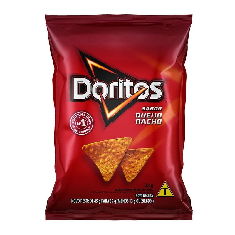 Doritos Sabor Queijo Nacho 32g O que é o Doritos Sabor Queijo Nacho? Doritos Sabor Queijo Nacho é um salgadinho crocante e irresistível, feito de tortillas de milho temperadas com um delicioso sabor de queijo nacho. Perfeito para quem busca um lanche saboroso e cheio de personalidade. Principais Benefícios do Doritos Sabor Queijo Nacho Textura crocante: Feito com tortillas de milho crocantes e saborosas. Sabor intenso: O clássico queijo nacho que todo mundo ama. Praticidade: Ideal para qualquer momento do dia. Perfeito para compartilhar: Excelente opção para encontros com amigos e família. Por que escolher o Doritos Sabor Queijo Nacho? Se você gosta de um snack crocante, saboroso e com um toque apimentado, Doritos Sabor Queijo Nacho é a escolha perfeita. Modo de consumo Pronto para consumo. Combine com molhos ou patês para uma experiência ainda mais saborosa. Advertências Contém derivados de leite. Pode conter traços de soja, trigo e glúten. Conservar em local seco e arejado.