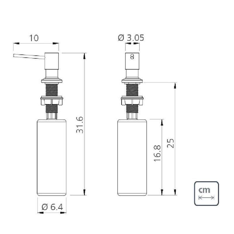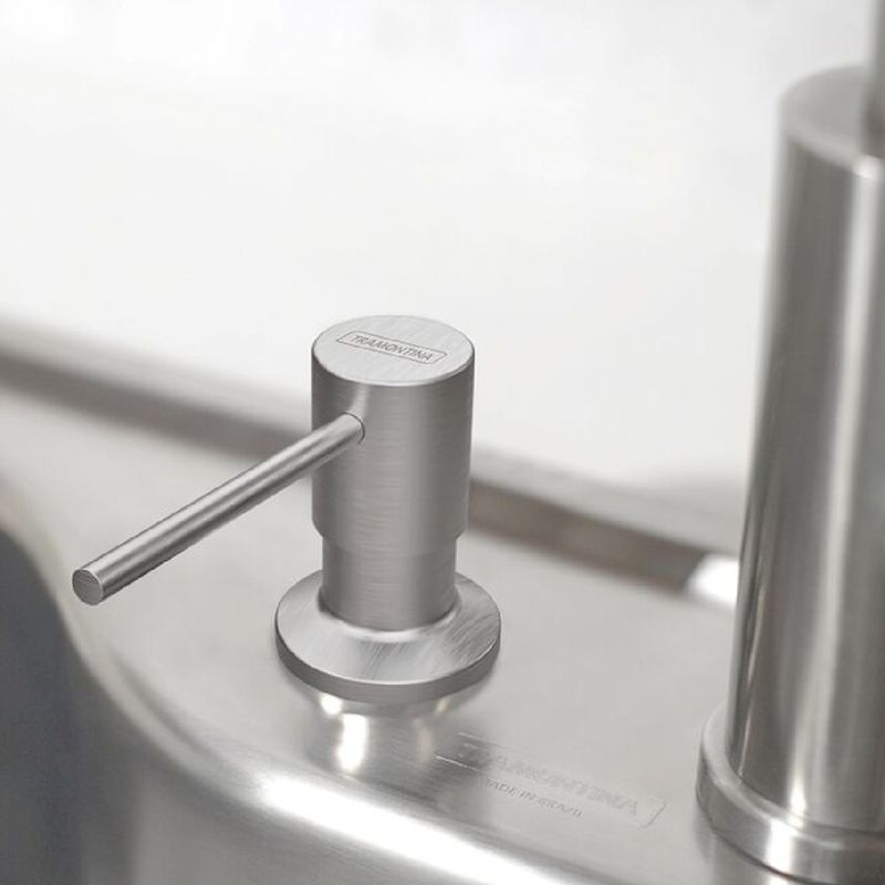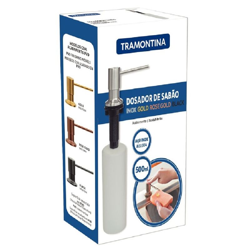 O dosador de sabão Tramontina é uma solução prática e elegante para otimizar a limpeza da sua cozinha. Produzido em aço inox com acabamento acetinado e recipiente plástico interno, facilita o uso diário ao manter o sabão sempre à mão, além de aproveitar melhor o espaço da bancada com um visual discreto e funcional. - Destaques:• Corpo em aço inox AISI 304, resistente e durável• Recipiente interno com capacidade de 500 ml• Acabamento acetinado, fácil de harmonizar com diferentes cozinhas• Instalação direta na bancada, garantindo praticidade no uso diário• Reabastecimento simples, realizado pela parte superior - Especificações:• Material do corpo: aço inox 304• Material do recipiente: plástico• Acabamento: acetinado• Capacidade: 500 ml• Furo para instalação: 3,5 cm• Altura: 31,6 cm• Largura: 10 cm• Comprimento: 6,4 cm• Peso: 125 g - Observações:• Para limpeza, utilize detergente neutro com esponja macia ou pano suave.• Evite o uso de produtos abrasivos para preservar o acabamento do aço inox.• Após a limpeza, enxágue e seque bem a peça para manter sua aparência original.• Para reabastecer o recipiente, basta puxar a tampa superior.• Recomenda-se o uso do produto Superinox para conservar o acabamento ao longo do tempo.