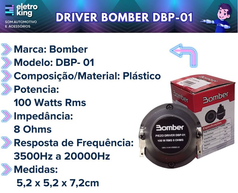 Driver Bomber DBP - 01 100 Watts Rms - 8 Ohms É uma excelente escolha para quem busca qualidade sonora e potência para o sistema de áudio. Com 100 Watts RMS e 8 Ohms de impedância, este driver é capaz de entregar um som claro e potente, ideal para projetos de médio e grande porte. Seu design robusto e a qualidade dos materiais garantem durabilidade e um desempenho confiável. Especificações Técnicas: • Marca: Bomber • Modelo: DBP-01 • Composição/Material: Plástico • Potencia: 100 Watts Rms • Impedância: 8 Ohms • Resposta de Frequência: 3500Hz a 20000Hz • Medidas: 5,2 x 5,2 x 7,2cm Conteúdo da Embalagem: • 01 Driver Bomber DBP - 01 100 Watts Rms Importante: • Garantia de 90 Dias. • Valor Unitário.