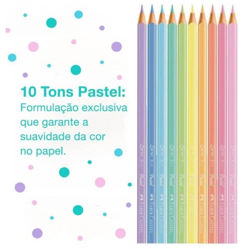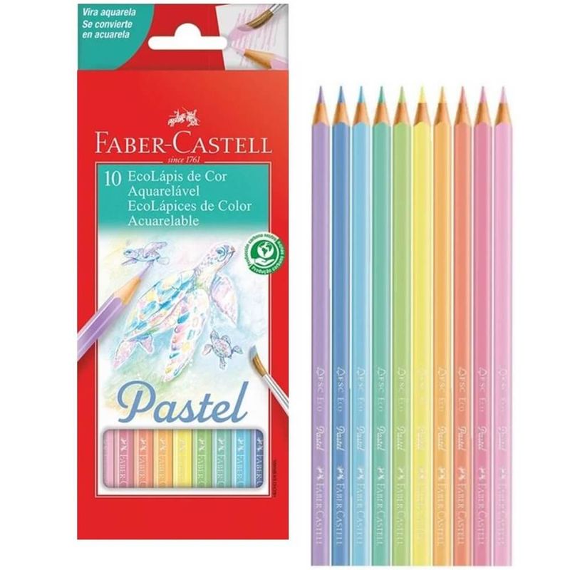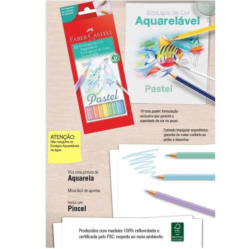 Ecolápis de Cor Aquarelável Pastel com 10 Cores (Ref.120210P) Faber-Castell Soltar a imaginação e colorir sempre foi um momento de diversão e descoberta, mas colorir com a linha Ecolápis da Faber Castell será uma nova experiência, solte a imaginação e deixe a criatividade fluir! Você terá a melhor qualidade e um lindo resultado com desenhos mais vivos e realistas em seus trabalhos! - Pintura Aquarelável: essa característica garante ao desenho um acabamento mais translúcido e oferece quase o mesmo efeito que uma tinta, após o desenho ser umedecido com o pincel levemente embebido em água; - Cores pastéis, suaves e delicadas que oferecem ótima cobertura;- Formato sextavado que facilita à pega e proporciona melhor apoio para os dedos;- Mina macia e fácil de apontar;- Processo especial de fabricação TS - Técnica Sekural, que proporciona maior resistência à ponta;- Especialmente indicado para atividades que despertem e estimulem a criatividade, independente da idade, excelente para ilustrações, desenhos, cartazes e tudo o que a imaginação mandar;- Recomendado para crianças acima de 4 anos; - Produzidos com madeira 100% reflorestada de alta qualidade, ecologicamente correto.- Atóxico e não perecível;- Embalagem 100% reciclável; - ATENÇÃO: Não mergulhe os Ecolápis Aquareláveis na água! Embalagem com 10 cores + 01 pincel Imagens meramente ilustrativas, as cores podem variar em cada tela ou monitor.