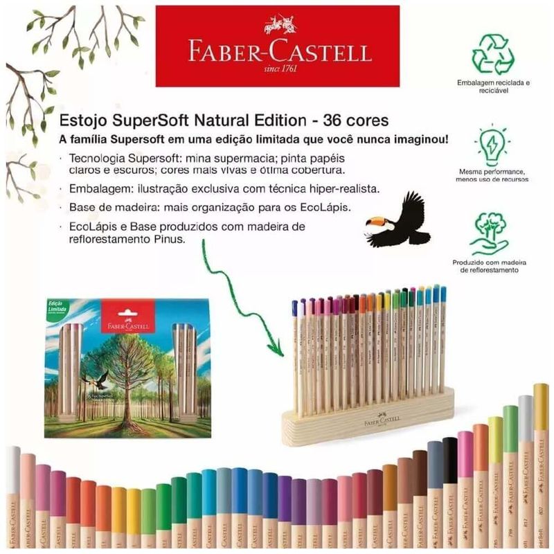 Ecolápis de Cor SuperSoft Natural Edition 36 Cores com Suporte de Madeira Edição Limitada - Faber-Castell Soltar a imaginação e colorir sempre foi um momento de diversão e descoberta, mas colorir com a linha Ecolápis Supersoft da Faber Castell será uma nova experiência, solte a imaginação e deixe a criatividade fluir! Você terá a melhor qualidade e um lindo resultado em seus trabalhos! - Tecnologia Supersoft: Mina super macia com formulação exclusiva que garante o máximo de conforto durante o uso, além de resistente, o que proporciona maior durabilidade ao produto e mais facilidade ao apontar; - EcoLápis de cor que possuem alto nível de pigmentos, oferecendo cores vivas e fortes;- Excelente cobertura sobre papéis claros e escuros;- Mesma performance com menos uso de recursos; - Formato redondo; - EcoLápis e base de madeira produzidos com madeira de reflorestamento Pinus; - Base de madeira: mais organização para os EcoLápis; - Embalagem reciclada e reciclável - Atóxico e não perecível; - EDIÇÃO LIMITADA Embalagem com 36 cores Imagens meramente ilustrativas, as cores podem variar em cada tela ou monitor.