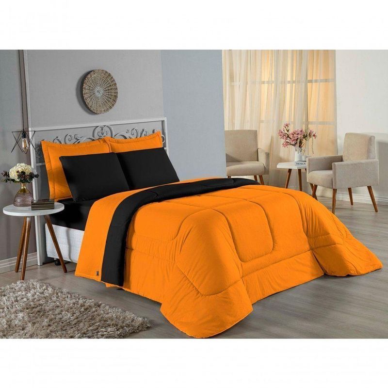 Edredom Solteiro Nobre 1 Peça Dupla Face 1,60m X 2,40m Malha 100% Algodão - Laranja / PretoTransforme suas noites de sono com o conforto supremo do Edredom Solteiro Nobre. A escolha ideal para quem não abre mão da maciez extrema e de um visual clean e moderno para o quarto.Por que o Edredom Nobre é a escolha perfeita?- Toque Extremamente Macio: Confeccionado em Malha 100% Algodão com Fio 30/1 Penteado, este edredom oferece uma sensação suave na pele, garantindo um descanso muito mais acolhedor.- Versatilidade Dupla Face: O modelo é dupla face e liso, permitindo variar a decoração da cama com facilidade e praticidade.- Aconchego na Medida Certa: Seu enchimento em fibra siliconada proporciona o volume e o aquecimento ideais para noites agradáveis.- Alta Qualidade: O fio penteado passa por um processo que retira as fibras mais curtas e impurezas, resultando em um tecido mais resistente e que não forma bolinhas com facilidade.Produto composto por (Total 01 Peça):01 Edredom Solteiro Dupla Face 1,60m x 2,40mComposição:Tecido: Malha 100% Algodão - Fio 30/1 PenteadoEnchimento: 100% Poliéster Siliconada