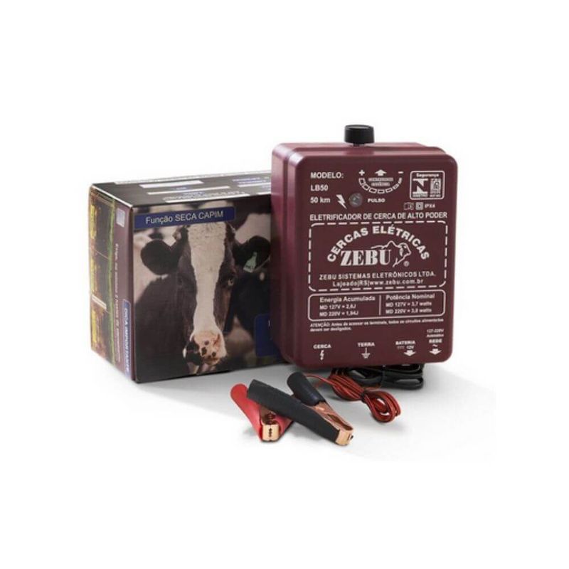 LB50 Automático / Bateria Eletrificador de Cerca Modelo LB50 Automático 220V / 127V / Bateria 12V • Alimentação.....................................................127/220V Automático e 12V • Raio de ação....................................................3.000 metros • Tensão de saída sem carga............................9 kV • Intervalo entre pulsos regulável....................1,05 a 2,2 segundos • Energia acumulada em 220 V........................1,94 Joules • Energia acumulada em 127 V........................2,6 Joules • Consumo de energia elétrica em 220 V........0,07 kW/dia • Consumo de energia elétrica em 127 V........0,08 kW/dia • Consumo da bateria 12 V...............................2,3 a 2,8 Ah/dia • Características: Com regulagem de cadência; Desviador de raios de baixa intensidade; Exige, no mínimo, duas hastes para aterramento;