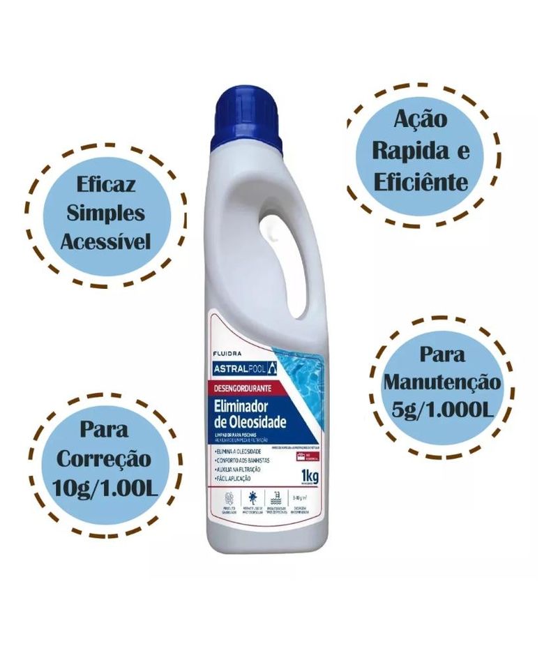 ELIMINADOR DE OLEOSIDADE GRANULADOO ELIMINADOR DE OLEOSIDADE GRANULADO previne o acumulo de partículas oleosas em suspensão na superfície da água da piscina provenientes do uso de bronzeadores e protetores solares.Além de poderoso desengordurante, atua também como clarificante e auxiliar de limpeza da piscina, reduzindo também sujidades nas bordas, pré-filtro e filtros da piscina.Marca: ASTRALPOOL