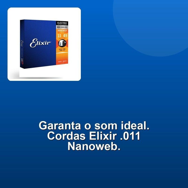 Encordoamento Guitarra .011 Medium Elixir NanowebDesbloqueie o som mais brilhante e mais natural com as cordas Elixir para Guitarra com Revestimento Nanoweb. Essas cordas revolucionárias oferecem um timbre brilhante e um toque suave, mantendo a vida útil do timbre estendida. Além disso, elas proporcionam desempenho consistente, toque mais natural e menos ruídos indesejáveis.Com a combinação perfeita de material Aço Niquelado e revestimento Nanoweb, essas cordas garantem uma performance superior. A tensão média de .011 é ideal para guitarristas que buscam um som mais equilibrado. As cordas Elixir são a escolha certa para qualquer estilo de música, desde rock até blues, jazz e mais.O revestimento Nanoweb é o segredo por trás da longevidade e do som incrível dessas cordas. Ele protege a corda do desgaste e mancha, garantindo que elas mantenham seu brilho e potência por muito tempo. Com as cordas Elixir, você pode se concentrar em tocar, sem precisar se preocupar com a qualidade do som.Desbloqueie o som mais brilhante e mais natural com as cordas Elixir para Guitarra com Revestimento Nanoweb. Essas cordas revolucionárias oferecem um timbre brilhante e um toque suave, mantendo a vida útil do timbre estendida. Além disso, elas proporcionam desempenho consistente, toque mais natural e menos ruídos indesejáveis.Com a combinação perfeita de material Aço Niquelado e revestimento Nanoweb, essas cordas garantem uma performance superior. A tensão média de .011 é ideal para guitarristas que buscam um som mais equilibrado. As cordas Elixir são a escolha certa para qualquer estilo de música, desde rock até blues, jazz e mais.O revestimento Nanoweb é o segredo por trás da longevidade e do som incrível dessas cordas. Ele protege a corda do desgaste e mancha, garantindo que elas mantenham seu brilho e potência por muito tempo. Com as cordas Elixir, você pode se concentrar em tocar, sem precisar se preocupar com a qualidade do som.