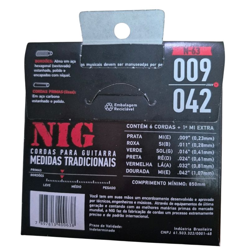 O Encordoamento NIG N63 009-042 é ideal para guitarristas que procuram tocabilidade leve, timbre brilhante e ótima definição sonora. Com calibre .009 ? .042, oferece pegada macia e confortável, sendo muito utilizado por iniciantes e músicos que preferem cordas mais leves. As cordas primas são feitas em aço carbono estanhado e polido, garantindo brilho e clareza nas notas. Já os bordões possuem revestimento em níquel sobre alma hexagonal de aço, proporcionando maior resistência, graves encorpados e melhor estabilidade de afinação. Fabricado com material importado e seguindo medidas em padrão internacional, o encordoamento NIG oferece qualidade e desempenho confiável para estudo, ensaios e apresentações. Além disso, o jogo acompanha 1ª corda (Mi) extra, trazendo mais praticidade para o músico no dia a dia. Características: Marca: NIG Modelo: N63 Instrumento: Guitarra elétrica Calibre: .009 ? .042 Tipo: Tradicional Cordas primas: Aço carbono estanhado Bordões: Níquel sobre alma hexagonal Conteúdo: 6 cordas + 1ª Mi extra Ideal para quem busca conforto ao tocar, timbre definido e excelente custo-benefício.