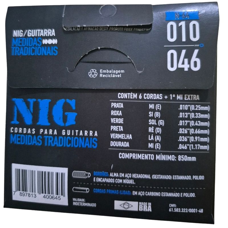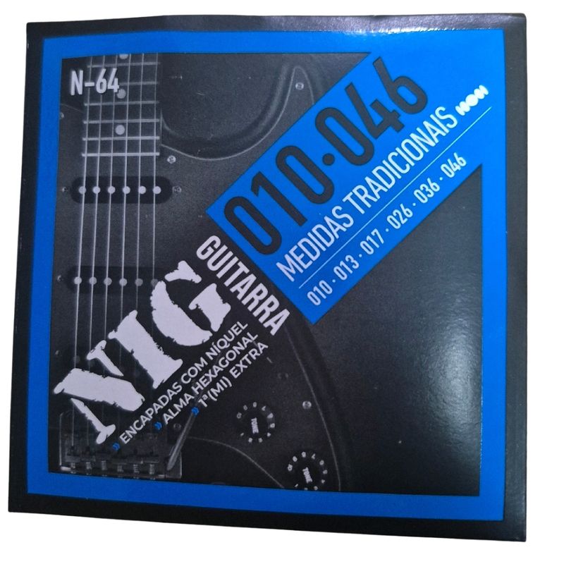 O Encordoamento NIG N64 010-046 é ideal para guitarristas que buscam timbre equilibrado, ótima tocabilidade e durabilidade. Com calibre .010 ? .046 (tensão média), oferece conforto para tocar e excelente resposta em diversos estilos musicais. As cordas lisas são feitas em aço carbono estanhado, garantindo brilho e definição nas notas. Já os bordões possuem alma em aço com revestimento em níquel, proporcionando graves encorpados e maior resistência ao desgaste. O jogo acompanha 1ª corda Mi extra e uma palheta de brinde, trazendo mais praticidade e ótimo custo-benefício para o músico. Características do produto: Marca: NIG Modelo: N64 Instrumento: Guitarra elétrica Calibre: .010 ? .046 Tipo: Tradicional Material: Aço com revestimento em níquel Tensão: Média Conteúdo: 6 cordas + 1ª Mi extra + 1 palheta Produto ideal para estudos, ensaios e apresentações, oferecendo som definido, estabilidade de afinação e excelente desempenho.