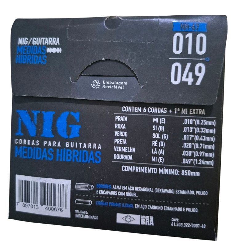 O encordoamento para guitarra NIG NH-67 foi desenvolvido para músicos que buscam equilíbrio entre conforto e potência sonora. Com medidas híbridas .010/.049, combina cordas mais leves nas primas e bordões mais encorpados, proporcionando agudos definidos para solos e graves fortes para riffs e acordes. As cordas primas são produzidas em aço carbono estanhado e polido, garantindo brilho e boa resposta sonora. Já os bordões possuem alma hexagonal de aço e encapamento em níquel, oferecendo maior durabilidade, estabilidade de afinação e timbre equilibrado. O jogo possui tensão híbrida, ideal para guitarristas que desejam facilidade para bends e solos nas cordas finas sem perder peso e definição nos graves. Características: Indicado para guitarra elétrica Marca: NIG Modelo: NH-67 Medidas híbridas .010 / .049 Bordões encapados com níquel Primas em aço carbono estanhado Alma hexagonal para maior resistência Timbre brilhante e equilibrado Calibres: 1ª Mi (E): .010 2ª Si (B): .013 3ª Sol (G): .017 4ª Ré (D): .028 5ª Lá (A): .038 6ª Mi (E): .049 Conteúdo da embalagem: 1 jogo de cordas para guitarra (6 cordas) 1 corda Mi extra 1 palheta de brinde