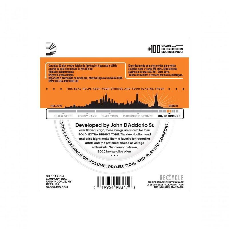 Encordoamento Para Violão Aço Ej10-b 80/20 BronzeA liga de bronze 80/20, foi a liga originalmente selecionada para instrumentos acústicos pelo Sr. John D Addario e John D'Angelico por volta de 1930. As 80/20 são populares para gravação graças ao timbre encorpado e grave cultuado por muitos tradicionalistas por seu significado histórico.Código - Nota - pol - mm - lbs. - kgPL010 - E - 0.010 - 0.25 - 16.20 - 7.35PL014 - B - 0.014 - 0.36 - 17.8 - 8.07BW023 - G - 0.023 - 0.58 - 27.2 - 12.34BW030 - D - 0.030 - 0.76 - 26.2 - 11.88BW039 - A - 0.039 - 0.99 - 24.5 - 11.11]]>