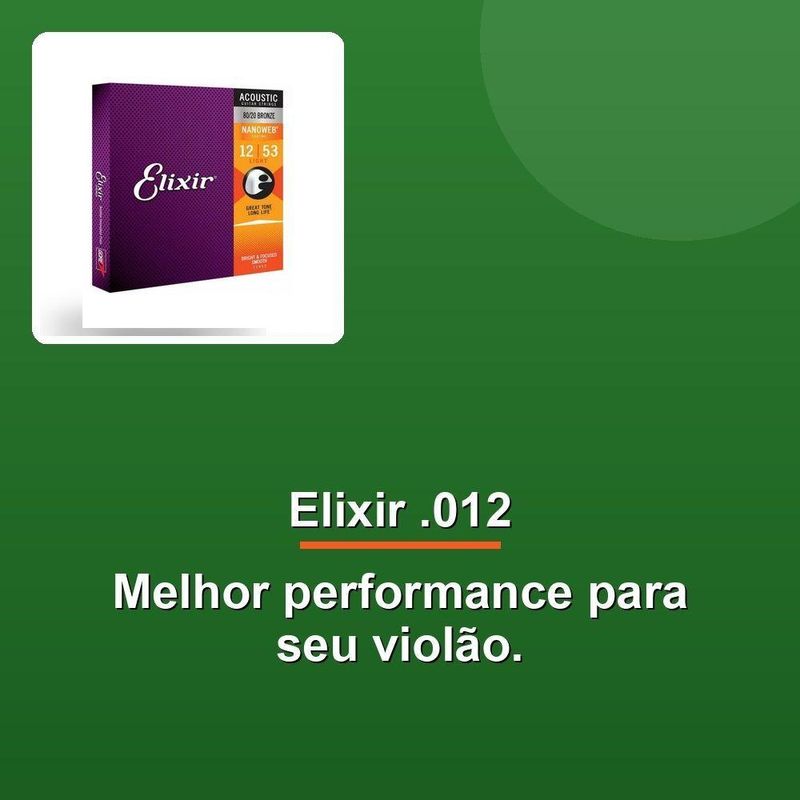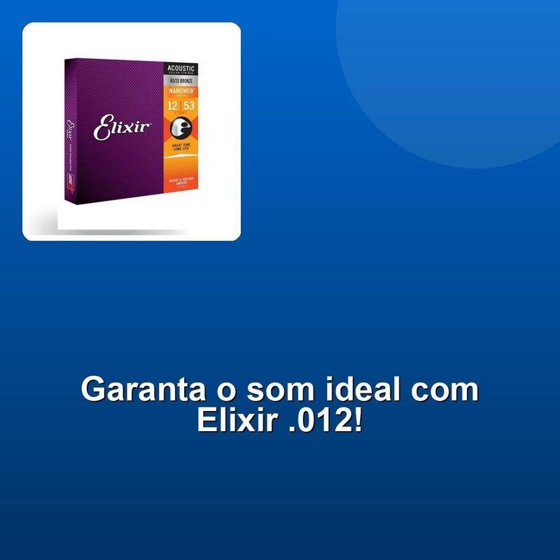 Encordoamento Violão .012 Light ElixirElevate seu som com os encordoamentos Elixir para Violão Aço com Revestimento Nanoweb. Desfrute do timbre vivo e cristalino das cordas tradicionais, agora com a vida útil estendida. Isso significa que você pode se concentrar em criar música incrível sem se preocupar com a perda de tonalidade ao longo do tempo.Além disso, esses encordoamentos proporcionam desempenho consistente, toque mais natural e reduzem ruídos indesejáveis. Isso significa que você pode se concentrar em suas habilidades musicais sem se distrair com interferências sonoras ruins.Composto por 80/20 Bronze, esses encordoamentos são projetados para violão de aço e oferecem uma tensão leve de .012, tornando-os ideais para músicos que buscam uma sensação mais suave. Além disso, o revestimento Nanoweb ajuda a reduzir odesgaste e a corrosão, tornando-os mais duráveis.Encontre o som perfeito para o seu violão com esses encordoamentos Elixir. Experimente-os hoje e descubra como eles podem transformar sua música em algo mais incrível!Elevate seu som com os encordoamentos Elixir para Violão Aço com Revestimento Nanoweb. Desfrute do timbre vivo e cristalino das cordas tradicionais, agora com a vida útil estendida. Isso significa que você pode se concentrar em criar música incrível sem se preocupar com a perda de tonalidade ao longo do tempo.Além disso, esses encordoamentos proporcionam desempenho consistente, toque mais natural e reduzem ruídos indesejáveis. Isso significa que você pode se concentrar em suas habilidades musicais sem se distrair com interferências sonoras ruins.Composto por 80/20 Bronze, esses encordoamentos são projetados para violão de aço e oferecem uma tensão leve de .012, tornando-os ideais para músicos que buscam uma sensação mais suave. Além disso, o revestimento Nanoweb ajuda a reduzir odesgaste e a corrosão, tornando-os mais duráveis.Encontre o som perfeito para o seu violão com esses encordoamentos Elixir. Experimente-os hoje e descubra como eles podem transformar sua música em algo mais incrível!