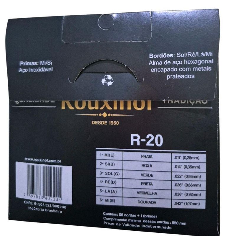 Encordoamento Violão Aço Rouxinol R20 Inox Com BolinhaEncordoamento Rouxinol R20 desenvolvido para violão de aço, oferecendo timbre brilhante, boa projeção sonora e excelente durabilidade. Ideal para músicos iniciantes e profissionais que procuram qualidade e ótimo custo-benefício.As cordas primas são produzidas em aço inoxidável, proporcionando maior resistência à oxidação. Os bordões possuem alma de aço com encapamento metálico que garante firmeza, estabilidade de afinação e som equilibrado.Possui acabamento com bolinha, facilitando a instalação no cavalete do violão.Características:Indicado para violão de açoModelo: R20Cordas primas em aço inoxBordões encapados com metal prateadoTimbre brilhante e definidoInstalação com bolinhaCalibres:.011 / .014 / .018 / .026 / .036 / .042Conteúdo da embalagem:1 jogo de cordas para violão (6 cordas)Encordoamento Violão Aço Rouxinol R20 Inox Com Bolinha