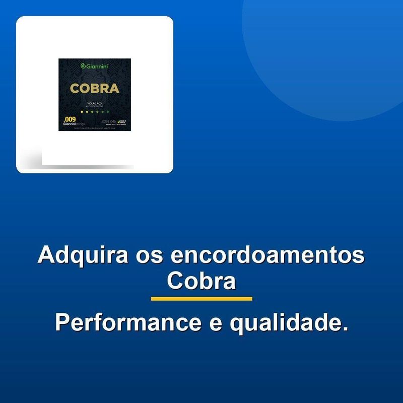 Encordoamento Violão Cobra Aço .009 Bronze GeewakDescubra o som perfeito com o encordoamento série Cobra para violão aço em bronze 85/15, confeccionado no Brasil com a alma de aço e revestimento em bronze 85/15. Com um acabamento em bolinha, essência do violão, e um comprimento de escala de 650 mm, você terá a possibilidade de criar sons únicos e emocionantes.Com bitolas cuidadosamente selecionadas - 0.23, 0.3, 0.38, 0.64, 0.89 e 1.14 mm -, você precisará de menos esforço e obterá mais resultados. Nosso compromisso com a qualidade é o que nos diferencia. Todos os nossos produtos passam por um rigoroso processo de seleção dos melhores fornecedores, garantindo que a sua compra seja uma experiência agradável.Além disso, nossa paixão pela excelência, fazendo com que cada membro da nossa equipe compartilhe o mesmo objetivo: proporcionar a você produtos que você possa confiar e se orgulhar de utilizar. Acreditamos que a qualidade não é apenas uma característica, mas um reflexo do nosso compromisso com a satisfação de nossos clientes.Descubra o som perfeito com o encordoamento série Cobra para violão aço em bronze 85/15, confeccionado no Brasil com a alma de aço e revestimento em bronze 85/15. Com um acabamento em bolinha, essência do violão, e um comprimento de escala de 650 mm, você terá a possibilidade de criar sons únicos e emocionantes.Com bitolas cuidadosamente selecionadas - 0.23, 0.3, 0.38, 0.64, 0.89 e 1.14 mm -, você precisará de menos esforço e obterá mais resultados. Nosso compromisso com a qualidade é o que nos diferencia. Todos os nossos produtos passam por um rigoroso processo de seleção dos melhores fornecedores, garantindo que a sua compra seja uma experiência agradável.Além disso, nossa paixão pela excelência, fazendo com que cada membro da nossa equipe compartilhe o mesmo objetivo: proporcionar a você produtos que você possa confiar e se orgulhar de utilizar. Acreditamos que a qualidade não é apenas uma característica, mas um reflexo do nosso compromisso com a satisfação de nossos clientes.