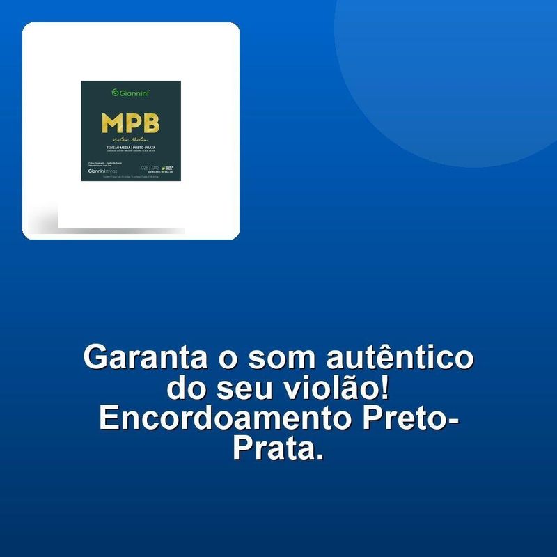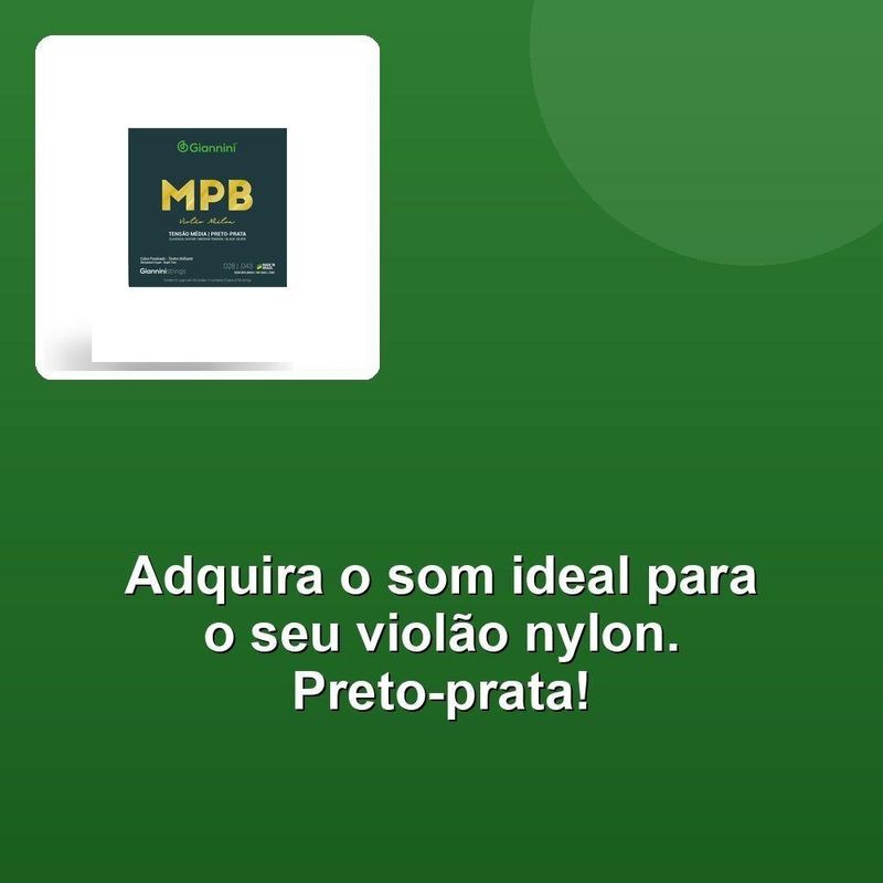 Encordoamento Violão Nylon Preto-prata S/ BolinhaDesbloqueie o som rico e autêntico com o Encordoamento Para Violão Nylon Preto-prata Tensão Média Sem Bolinha Genwbs. Conhecido por sua serie MPB, este encordoamento é especialmente projetado para violões nylon, apresentando bordões em cobre prateado e primas em nylon preto. A combinação perfeita para criar um som grave e emocional.A alma em náilon garante uma boa sustentação e resistência ao estresse, enquanto o revestimento em cobre prateado adiciona um toque de classe e sofisticação. Além disso, o acabamento color code proporciona uma aparência atraente e moderna.Com um comprimento de escala de 648 mm / 25 1/2 polegadas, o encordoamento se adapta perfeitamente às necessidades de qualquer músico, seja iniciante ou profissional. Experimente o som autêntico e emocional com o Encordoamento Para Violão Nylon Preto-prata Tensão Média Sem Bolinha Genwbs.Desbloqueie o som rico e autêntico com o Encordoamento Para Violão Nylon Preto-prata Tensão Média Sem Bolinha Genwbs. Conhecido por sua serie MPB, este encordoamento é especialmente projetado para violões nylon, apresentando bordões em cobre prateado e primas em nylon preto. A combinação perfeita para criar um som grave e emocional.A alma em náilon garante uma boa sustentação e resistência ao estresse, enquanto o revestimento em cobre prateado adiciona um toque de classe e sofisticação. Além disso, o acabamento color code proporciona uma aparência atraente e moderna.Com um comprimento de escala de 648 mm / 25 1/2 polegadas, o encordoamento se adapta perfeitamente às necessidades de qualquer músico, seja iniciante ou profissional. Experimente o som autêntico e emocional com o Encordoamento Para Violão Nylon Preto-prata Tensão Média Sem Bolinha Genwbs.