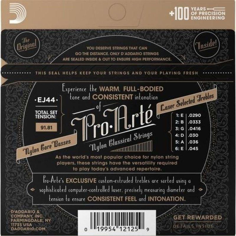 Encordoamento Violão Nylon Tensão Alta Pro-arte AddarioO Encordoamento Para Violão D Addario EJ44 é o parceiro perfeito para os músicos que buscam um som de alta qualidade e durabilidade. Desenvolvidas em nylon revestido de prata, as cordas produzem um som penetrante e equilibrado, com um timbre insuperável. Além disso, garantem uma maior durabilidade, atendendo aos requisitos dos mais conhecidos padrões de afinação.Com uma aplicação específica para violão de tensão alta, as cordas apresentam uma configuração única: .029 - .045 - Extra Pesada. O material utilizado é nylon de alta qualidade, garantia de uma sonoridade clara e precisa. A pesquisa desenvolvida pela D'Addario resultou em uma camada envoltória em prata, que ajuda a destacar o som.Essas cordas são a primeira opção entre os maiores profissionais do ramo, devido à sua performance superior. Com um calibre de 029 - 033 - 041 - .030 - .036 - .045, elas garantem uma resposta rápida e precisa, ideal para os músicos que buscam um desempenho de alta qualidade.O Encordoamento Para Violão D Addario EJ44 é o parceiro perfeito para os músicos que buscam um som de alta qualidade e durabilidade. Desenvolvidas em nylon revestido de prata, as cordas produzem um som penetrante e equilibrado, com um timbre insuperável. Além disso, garantem uma maior durabilidade, atendendo aos requisitos dos mais conhecidos padrões de afinação.Com uma aplicação específica para violão de tensão alta, as cordas apresentam uma configuração única: .029 - .045 - Extra Pesada. O material utilizado é nylon de alta qualidade, garantia de uma sonoridade clara e precisa. A pesquisa desenvolvida pela D'Addario resultou em uma camada envoltória em prata, que ajuda a destacar o som.Essas cordas são a primeira opção entre os maiores profissionais do ramo, devido à sua performance superior. Com um calibre de 029 - 033 - 041 - .030 - .036 - .045, elas garantem uma resposta rápida e precisa, ideal para os músicos que buscam um desempenho de alta qualidade.