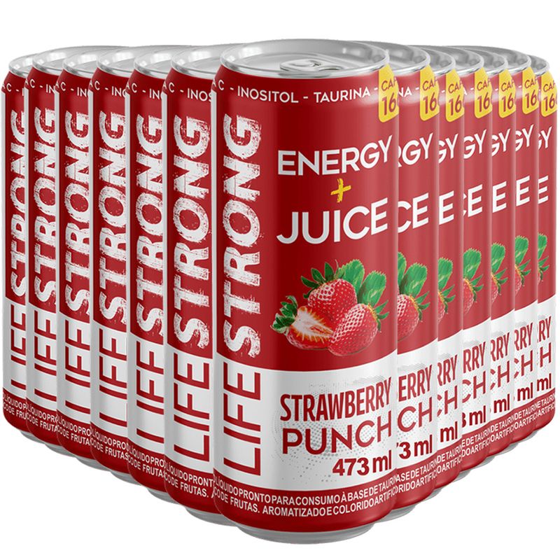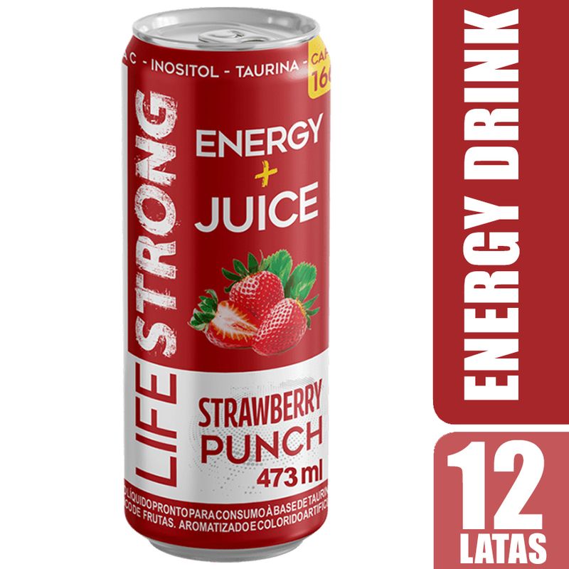 LATÃO COM MUITO MAIS SABOR E ENERGIA! Suco de MANGA e STRAWBERRY PUNCH com energia LIFE STRONG, sabor irado da fruta junto com o clássico energético da LIFE STRONG faz com que a energia da festa dure por dias. Muito mais energia e mais suco no latão de 473ml.