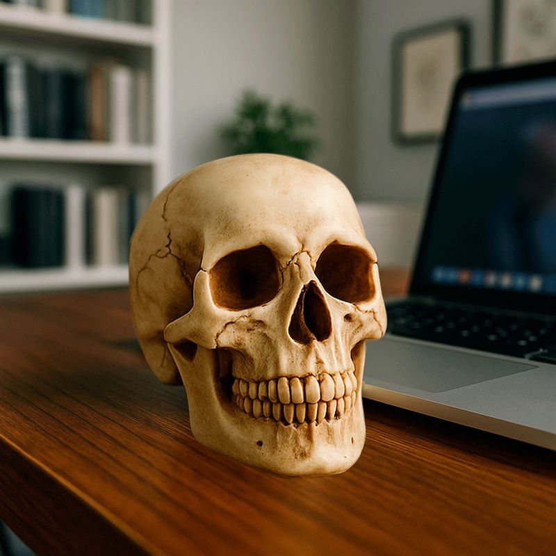 Destaque sua decoração com os Enfeites de Crânio Humano em Resina – peças que combinam realismo, acabamento refinado e versatilidade para diversos ambientes. Ideais para composições góticas, temáticas de Halloween, vitrines criativas, consultórios alternativos ou até mesmo como objeto de estudo decorativo. Produzidos em resina de alta qualidade, esses crânios impressionam pelo nível de detalhe, inclusive nas versões menores. São perfeitos para composições individuais ou em série. A coloração bege fosca simula ossos reais, oferecendo um visual impactante com toque artesanal. Benefícios: Alta fidelidade anatômica, mesmo nos modelos menores Acabamento detalhado e resistente Ideal para ambientes temáticos, Halloween ou consultórios Produto leve, durável e fácil de posicionar Especificações Técnicas: Material: Resina Cor: Bege (única) Tamanho: Altura: 11,5cm / Largura: 8cm / Comprimento: 13,5cm Acabamento: Detalhado artesanal Garantia: 90 dias para defeitos de fabricação Cuidados e Conservação: Limpar com pano seco Evitar exposição direta à umidade extrema Manter em ambiente arejado para preservar o acabamento Garanta já o seu! Decore com personalidade, impacto visual e qualidade superior. Cada peça é única e feita para impressionar.