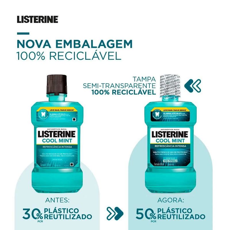 Enxaguante Bucal Listerine Cool Mint Refrescância Intensa 500ml O que é o Enxaguante Bucal Listerine Cool Mint? O Listerine Cool Mint Refrescância Intensa é um enxaguante bucal antisséptico formulado com álcool, indicado para eliminar até 99,9% dos germes causadores de problemas bucais, como plano bacteriano, mau hálito e gengivite . Ele vai além da escovação, alcançando até 100% da boca, inclusive nas áreas onde a escova de dentes e o fio dental não chegam. Para que serve o Listerine Cool Mint? O Listerine Cool Mint serve como complemento à escovação, garantindo uma higienização bucal completa. Ele elimina germes e promove uma sensação de refrescância prolongada com sabor de hortelã, protegendo contra problemas bucais por até 12 horas. Ideal para manter a boca limpa e saudável durante o dia. Benefícios do Listerine Cool Mint Elimina 99,9% dos germes causadores de placa bacteriana, mau hálito e gengivite; Refrescância intensa com sabor de hortelã; Proteção de até 12 horas contra germes; Atingir áreas da boca que a escova e o fio dental não alcançam; Fórmula com álcool para uma limpeza profunda. Como usar o Listerine Cool Mint? Após escovar os dentes e usar fio dental, utilize 20ml de Listerine Cool Mint. Faça bochechos por 30 segundos, duas vezes ao dia (manhã e noite). Não diluir em água e não ingerir. Precauções e advertências Não engula. Em caso de ingestão, procure assistência médica imediatamente. Não administrar a menores de 12 anos. Suspenda o uso se houver hipersensibilidade dentária e consulte um dentista. Armazenar em temperatura ambiente , ao abrigo da luz solar direta. Evite o contato com os olhos . Não recomendado para pessoas com hipersensibilidade aos ingredientes da fórmula. Compre online na Farmácia Indiana!