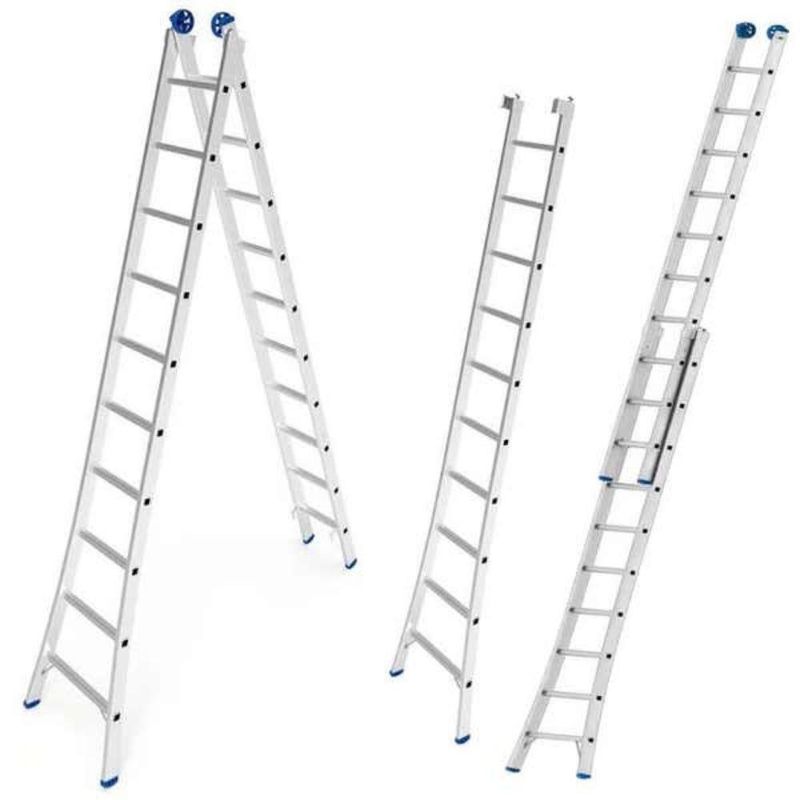 Escada de Alumínio Extensiva 2 x 10 Degraus 3.09 x 5.05 Metros EVALD MAX A Escada Extensiva 2x10 oferece três modos de utilização, os quais podem se adequar a sua necessidade: extensível, aberta e simples.Suporta até 150 kg e alcança até 5,05 metros. Sua estrutura é confeccionada 100% em alumínio, garantindo melhor qualidade estrutural ao produto, pois há controle de todo processo de fabricação.Além disso, o alumínio é um material leve e durável mesmo em áreas litorâneas. A escada conta com rodas que facilitam o uso, sistema de articulação com encaixe de travamento que proporciona maior segurança e abertura cônica dos pés e sapatas antiderrapantes, garantindo mais estabilidade. Dados TécnicosMaterial: AlumínioModo Simples: 3,02 mModo Aberta: 2,95 mModo Extensível: 5,05 mCapacidade: 150 kgEspessura: 13,50 cmLargura: 59 cmPeso: 10,15 kg Garantia: 12 MesesReferência: EVEM210Marca: Evald * Imagens meramente ilustrativas.