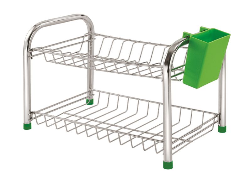 Escorredor de louças duplo fabricado em aço cromado, acompanhado de 01 porta-talheres verde em plástico, totalizando 02 peças. O produto é desmontável e conta com capacidade para até 12 pratos, tendo dimensões ideais para comportar suas louças com mais praticidade e higiene. Invista em organizadores e outros utensílios que tornam o espaço gourmet dinâmico e funcional.