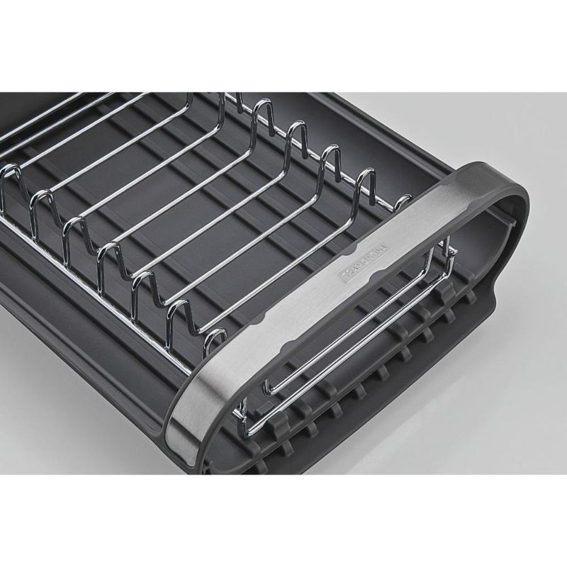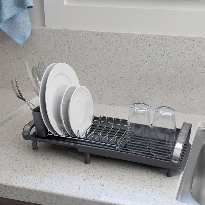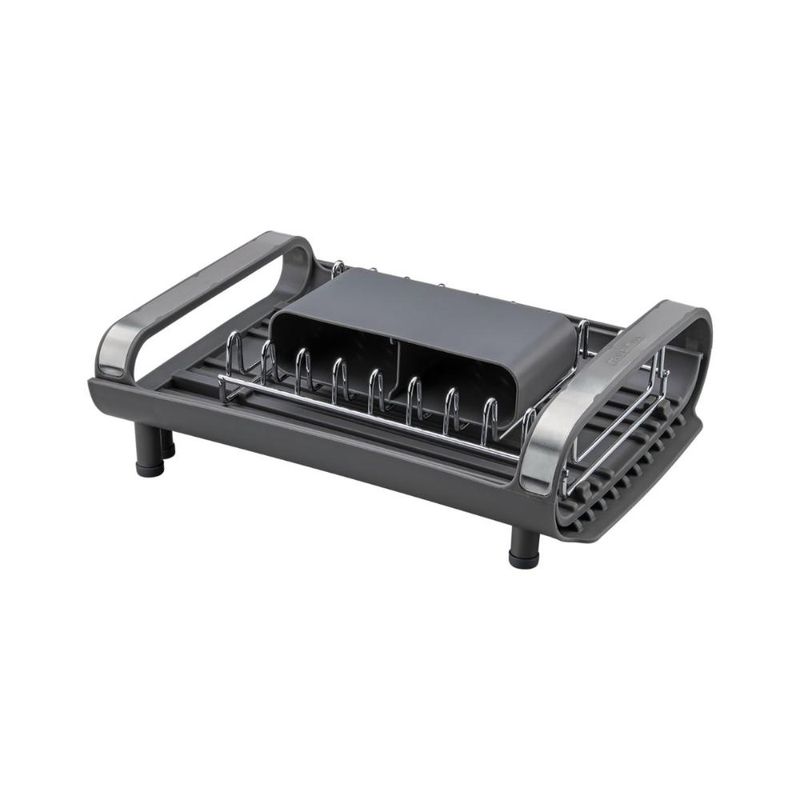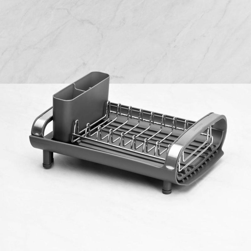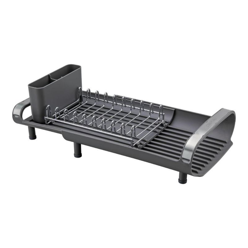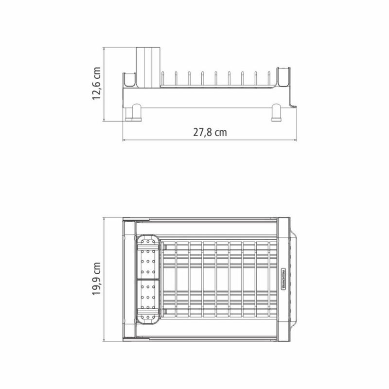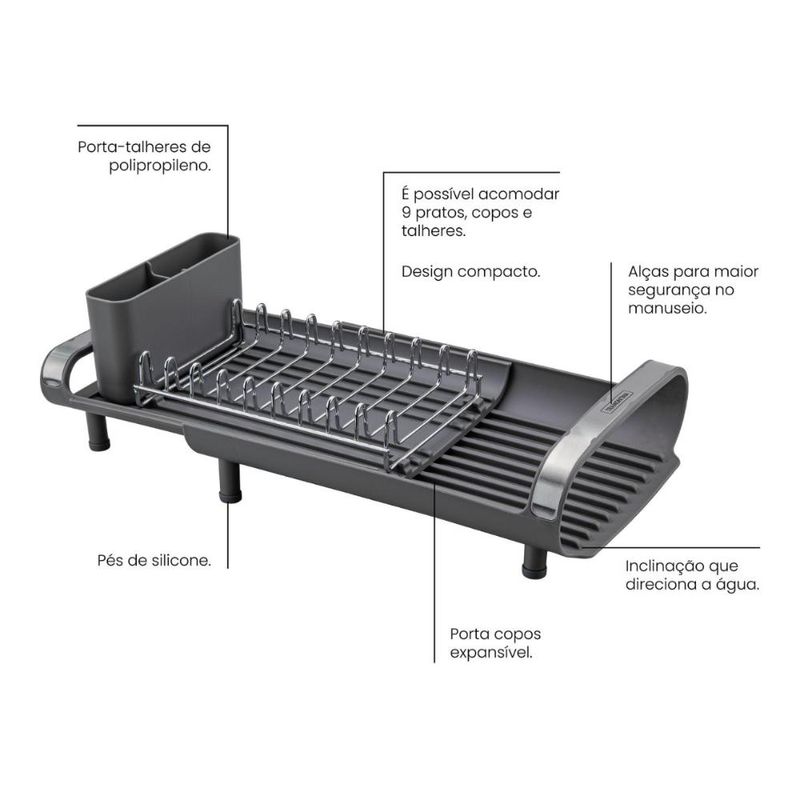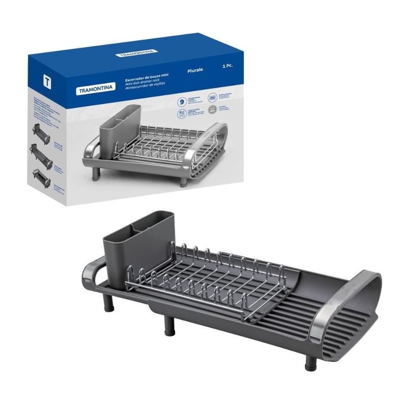 Escorredor De Louça Plurale Com Porta Talheres Tramontina Para aqueles dias de rotina corrida que você não tem muito tempo para as tarefas de casa, conte com o míni escorredor de louça Tramontina com secador e porta talheres grafite. Desenvolvido especialmente para cozinhas pequenas e que possuam bancadas com pouco espaço, ele conta com um prático porta talheres em polipropileno com perfeito encaixe em sua superfície. Compacto mais sem deixar de acomodar as louças que você precisa, ele comporta 9 pratos, talheres e copos, sendo o porta copos expansível. Possui alças que proporcionam maior segurança no manuseio e inclinação que direciona a água para a bandeja coletora, fazendo com que ela caia direto para a pia. Um item prático e indispensável para quem está sempre na correria! Descrição do produto: Marca: Tramontina Cor: Grafite Linha Comercial: Plurale Capacidade: é possível acomodar 9 pratos, copos e talheres Medidas fechado: 12,6cm x 19,9cm x 27,8cm (AxLxC) Com alças: Sim Com porta copos expansível: Sim Com porta pratos: Sim Com porta talheres: Sim Com bandeja coletora de água: Sim Com pés de silicone: Sim Imagens meramente ilustrativas, todos os itens que ambientam o produto não estão inclusos.