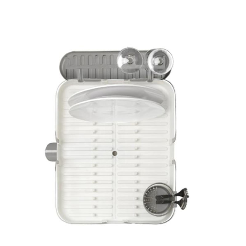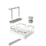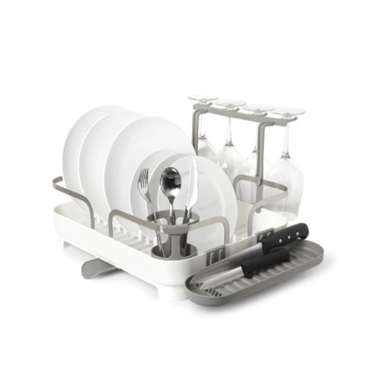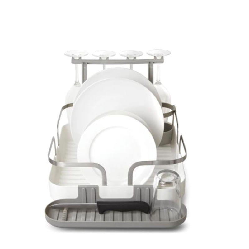 Este escorredor de pratos é feito de plástico moldado e possui uma estrutura de aço inoxidável, tornando-o durável e fácil de limpar. Tem capacidade para 15 pratos, armazenamento de utensílios, suporte móvel para taças, bandeja lateral multiuso e ponto de drenagem de posição dupla.