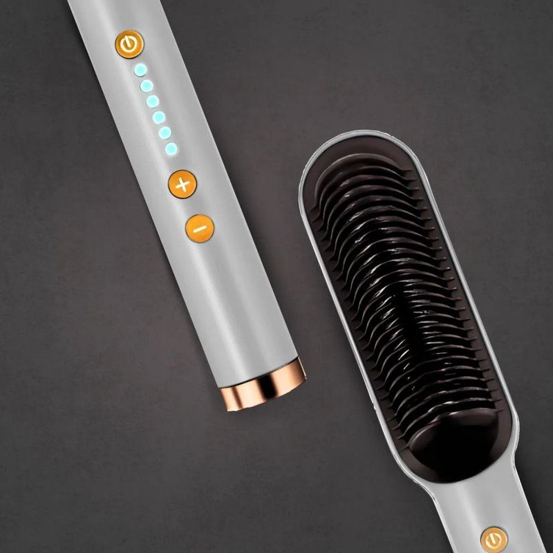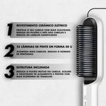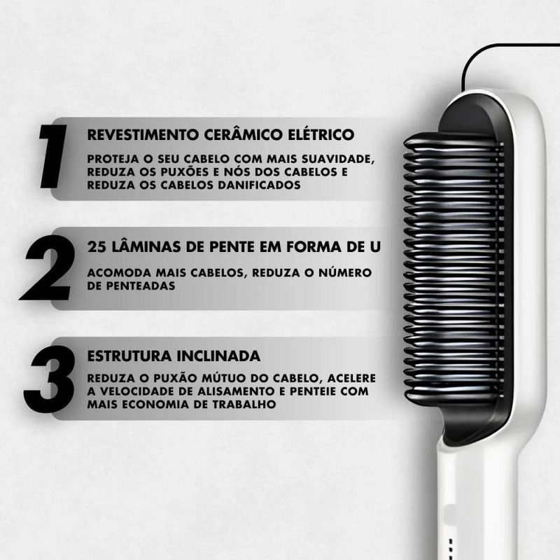 Escova Alisadora E Modeladora 5 Em 1 Bivolt Com Tecnologia De Cerâmica Ptc - BrancoEscova Alisadora de Cabelo 5 em 1 – Tecnologia, Praticidade e Beleza em um Só ProdutoA Escova Alisadora de Cabelo 5 em 1 foi criada para revolucionar sua rotina de cuidados com os cabelos. Com design moderno e tecnologia avançada, ela combina cinco funções essenciais — secar, alisar, modelar, hidratar e alinhar — em um único aparelho, garantindo praticidade, rapidez e resultados de salão no conforto da sua casa.Equipada com um regulador inteligente de temperatura, a escova adapta-se a todos os tipos de cabelo, proporcionando um alisamento seguro e eficaz sem agredir os fios. Sua tecnologia de cerâmica iônica mantém o brilho natural, reduz o frizz e protege contra danos causados pelo calor.Faixas de Temperatura:- 80°C a 130°C: ideal para cabelos finos e lisos- 130°C a 150°C: indicado para cabelos loiros, tingidos ou descoloridos- 150°C a 170°C: perfeito para cabelos normais e levemente ondulados- 170°C a 190°C: ideal para cabelos ondulados e volumosos- 190°C a 200°C: recomendado para cabelos grossos e encaracoladosBenefícios:- Economia de tempo: alisa mais fios de uma só vez com sua ampla área de contato- Cerdas de cerâmica em formato “V”: promovem brilho, maciez e reduzem pontas duplas- Proteção térmica: evita queimaduras e danos ao couro cabeludo- Design leve e ergonômico: fácil de usar, ideal para uso diário ou profissional- Aquecimento rápido: pronta para uso em poucos segundos- Cabo giratório 360°: liberdade total de movimento durante o uso- Acabamento perfeito: resultado liso, natural e com movimentoEspecificações Técnicas:- Potência: 34W- Frequência: 50–60Hz- Voltagem: 110V/220V (bivolt automático)- Temperatura: 5 níveis ajustáveis (80°C a 200°C)- Material das placas: cerâmica PTCConteúdo da Embalagem:- 1x Escova Alisadora de Cabelo 5 em 1- 1x Manual de instruçõesA Escova Alisadora 5 em 1 é a aliada perfeita para quem busca eficiência, beleza e praticidade em um único aparelho. Transforme sua rotina e conquiste cabelos lisos, brilhantes e saudáveis todos os dias.escova alisadora cabelo 5em1 cerâmica bivolt iônica profissional
