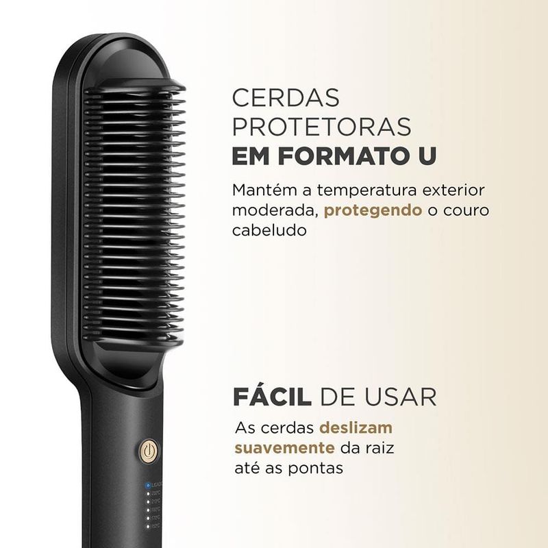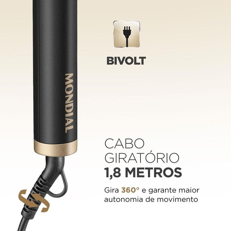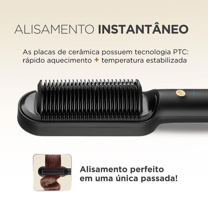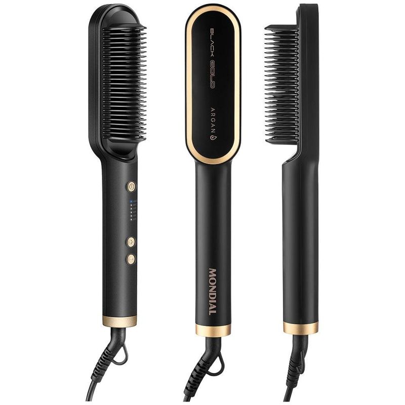 Cuidado e proteção para um liso perfeito! A tecnologia presente na Escova Alisadora EA-06, garante um alisamento Instantâneo da raiz até as pontas. As placas de cerâmica revestidas com óleo de Argan, garantem proteção, nutrição e hidratação dos fios, proporcionando um liso intenso com muito brilho. Saiba mais sobre a Escova Alisadora EA-06.As placas de cerâmica da Escova Black Gold Argan possuem tecnologia PTC, que promovem o rápido aquecimento, além de manter a temperatura estabilizada, garantindo um alisamento perfeito em uma única passada!A Escova Alisadora Mondial promove uma distribuição uniforme de calor e libera partículas que protegem, hidratam e nutrem as mechas, tudo isso graças ao seu revestimento em cerâmica com óleo de Argan. O resultado é um cabelo com menos frizz, maciez e muito brilho.Conta com cabo giratório 360° e com 1,8m de comprimento, para mais autonomia na movimentação. Enquanto as placas de cerâmica no interior da escova aquecem até 230°C, o formato das cerdas em "U", mantém a temperatura exterior moderada, garantindo mais proteção para o couro cabeludo.