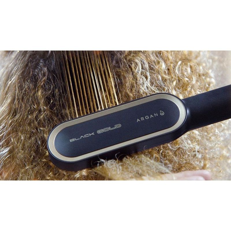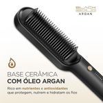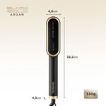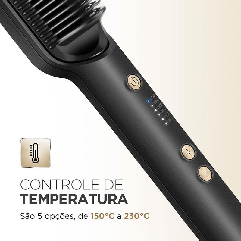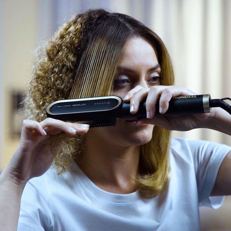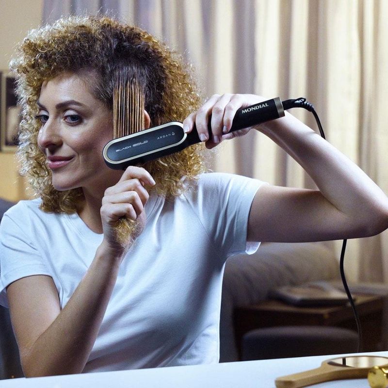 Cuidado e proteção para um liso perfeito! A tecnologia presente na Escova Alisadora EA-06, garante um alisamento Instantâneo da raiz até as pontas. As placas de cerâmica revestidas com óleo de Argan, garantem proteção, nutrição e hidratação dos fios, proporcionando um liso intenso com muito brilho. Saiba mais sobre a Escova Alisadora EA-06.As placas de cerâmica da Escova Black Gold Argan possuem tecnologia PTC, que promovem o rápido aquecimento, além de manter a temperatura estabilizada, garantindo um alisamento perfeito em uma única passada!A Escova Alisadora Mondial promove uma distribuição uniforme de calor e libera partículas que protegem, hidratam e nutrem as mechas, tudo isso graças ao seu revestimento em cerâmica com óleo de Argan. O resultado é um cabelo com menos frizz, maciez e muito brilho.Conta com cabo giratório 360° e com 1,8m de comprimento, para mais autonomia na movimentação. Enquanto as placas de cerâmica no interior da escova aquecem até 230°C, o formato das cerdas em "U", mantém a temperatura exterior moderada, garantindo mais proteção para o couro cabeludo.
