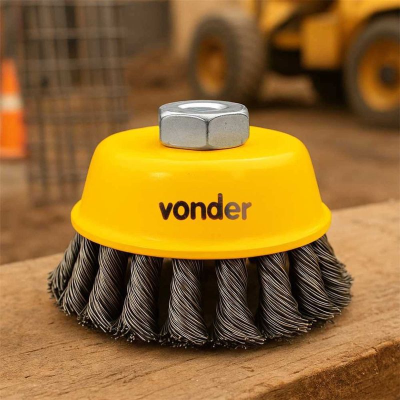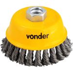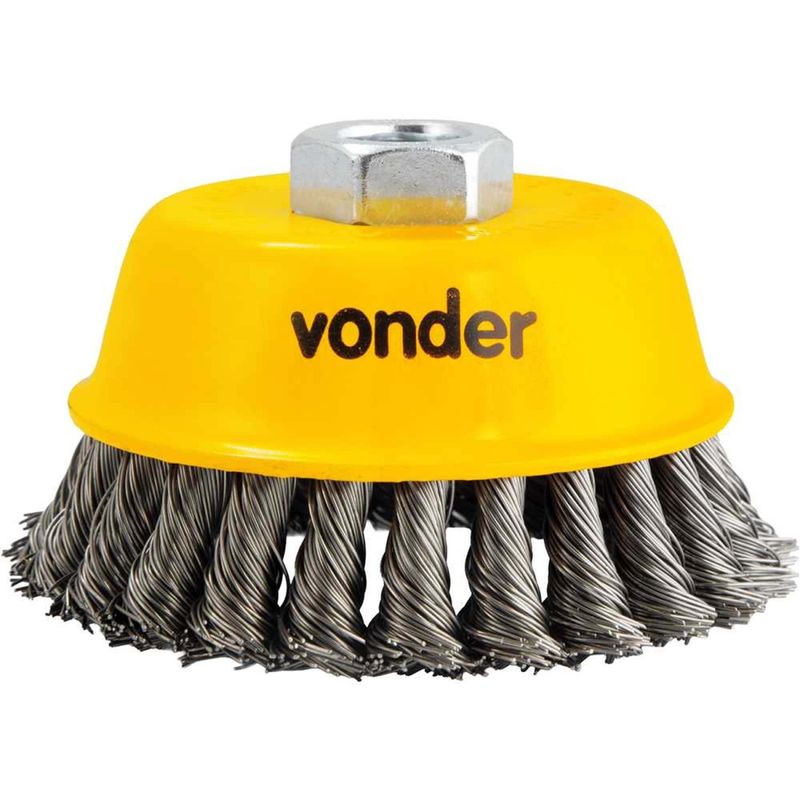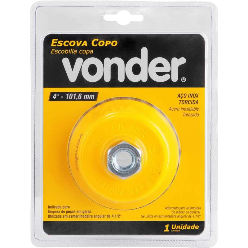 Escova de aço Inox Tipo Copo, 4", Torcida Vonder OstenVonder - Conteúdo da embalagem: 1 Escova tipo copo com rosca. Aplicação: Indicada para limpeza de peças em geral. Utilizada em esmerilhadeira angular de 7". Destaques: Cerdas em em aço inox torcido, que proporciona maior resistência contra oxidação/corrosão e maior poder de desbaste. Garantia - E (CDC): Garantia legal: 90 dias Referência: 6325014004 Massa aproximada (peso): 0,530 kg Diâmetro: 4" - 101,6 mm Rosca: M14 Diâmetro do fio: 0,50 mm Rotações por minuto - rpm: 8.500/min Destaques Comercial: Cerdas em aço inox torcido, com alta resistência à corrosão e excelente poder de desbaste. Aplicação Comercial: Limpeza de peças em geral. Uso em esmerilhadeira angular de 7". Características Gerais do Produto: Garantia: • 3 Meses