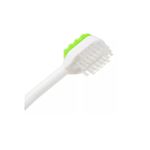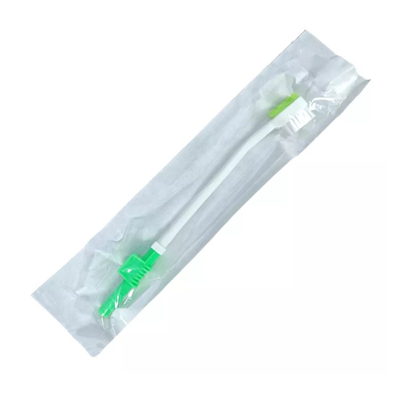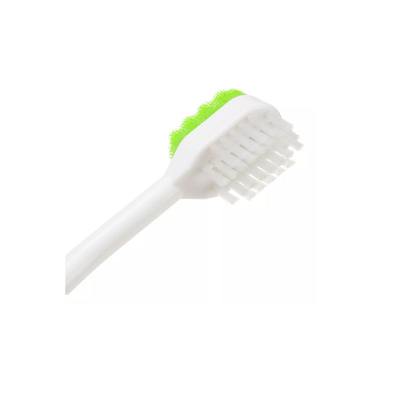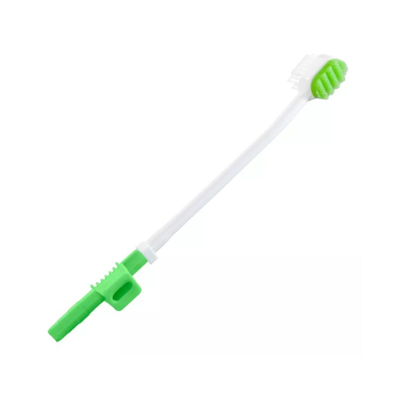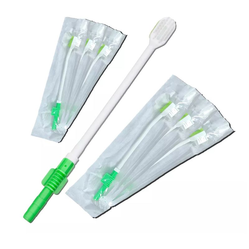 Escova dental descartável para higiene oral de pacientes em ventilação mecânica ou outro tipo de terapia respiratória, com haste apropriada para alcance de toda cavidade bucal e com orifício para aspiração à vácuo. Escova dental com duas face, uma feita com cerdas macias de Nylon Tynex Dupont 0,12mm e uma face feita com espuma reticulada de poliuretano, atóxica, Macia, com orifício central para aspiração à vácuo.Comprimento da cabeça da escova: 2,5 cm. Haste/cabo resistente,Cor branca, com leve inclinação (aproximadamente 80 °) na sua porção distal (a mcm da cabeça) e na ponta oposta possui conector com 3 níveis para aspirador e orifício anatômico para controle da aspiração.Comprimento total: 19 cm.Embalada em papel grau cirúrgico e filme plástico com abertura asséptica.