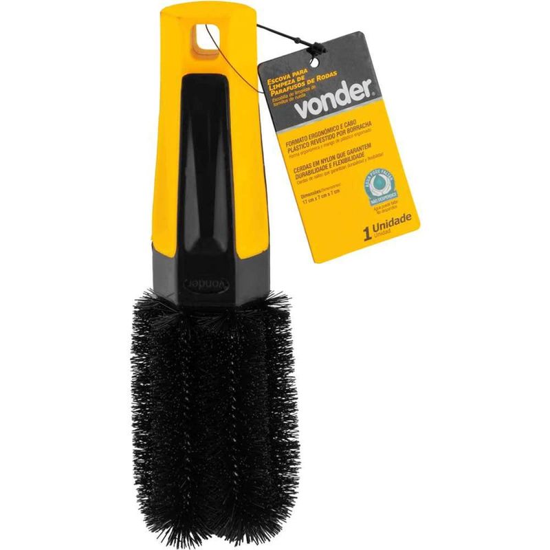 Escova Para Limpeza de Parafusos de Rodas Vonder - Conteúdo da embalagem: 1 Escova. Aplicação: Indicada para limpeza de parafusos de rodas. Destaques: Possui formato ergonômico com cabo em plástico revestido por borracha que facilita a limpeza rápida e eficiente de parafusos de rodas. As cerdas em nylon garantem durabilidade e flexibilidade, alcançando áreas de difÃcil acesso. Garantia - E (CDC): Garantia legal: 90 dias Referência: 6364000185 Massa aproximada (peso): 0,07 kg Material: Cerdas em nylon com cabo plástico com revestimento emborrachado Dimensões: Comprimento 170 mm x Largura: 70 mm x Altura: 70 mm Destaques Comercial: Formato ergonômico com cabo em plástico e borracha para fácil limpeza de parafusos de rodas; cerdas em nylon duráveis e flexÃveis alcançam áreas de difÃcil acesso. Aplicação Comercial: Indicada para limpeza de parafusos de rodas. Características Gerais do Produto: Garantia: • 3 Meses