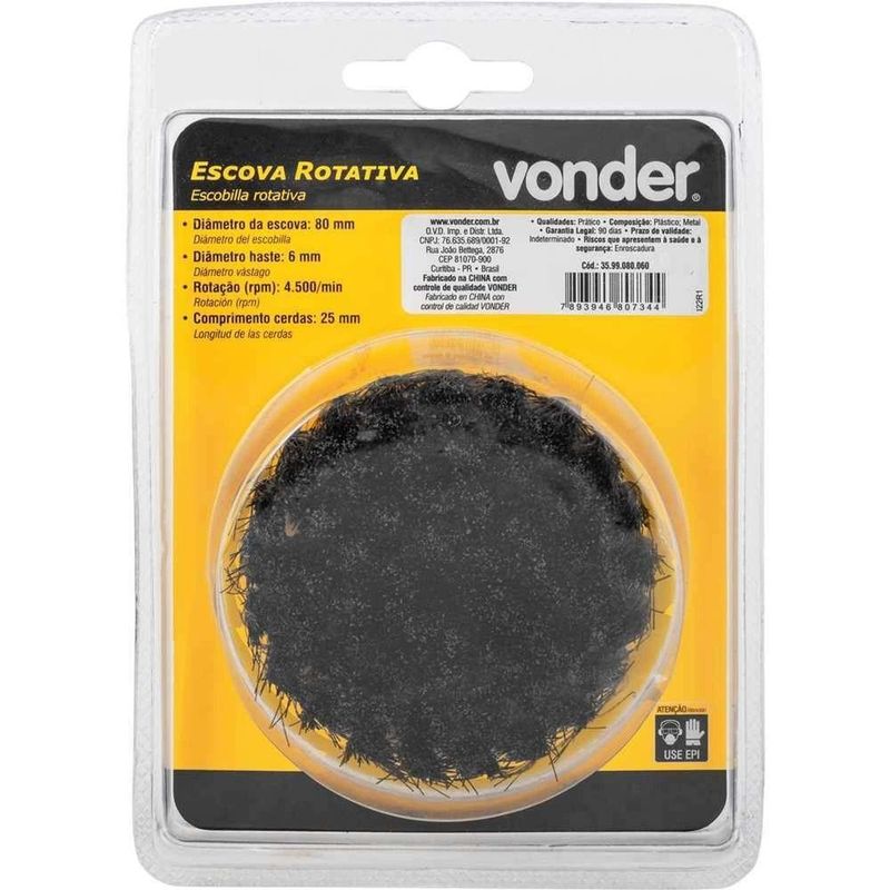 Escova Rotativa 80 Mm, Em Nylon, Vonder OstenvonderEscova Rotativa 80 mm, em Nylon, Vonder OstenVonder -Conteúdo da embalagem: 1 Escova rotativa.Aplicação: Indicada para limpeza em superfícies frágeis, permitindo a utilização em furadeiras e parafusadeiras.Destaques: Possui cerdas macias, fabricadas em nylon.Referência: 3599080060Garantia - E (CDC): Garantia legal: 90 diasDiâmetro da escova: 80,0 mmDiâmetro da haste da escova (mm): 6,0 mmMaterial/acabamento das cerdas da escova: NylonMassa aproximada (peso): 0,086 kgRotações por minuto - rpm: 4.500/minDestaques Comercial: Possui cerdas macias, fabricadas em nylon.Aplicação Comercial: Indicada para limpeza de superfícies frágeis, compatível com furadeiras e parafusadeiras.Características Gerais do Produto:Garantia: - 3 Meses