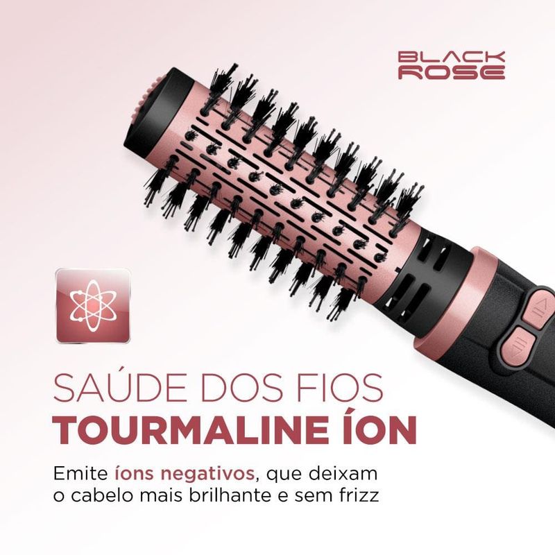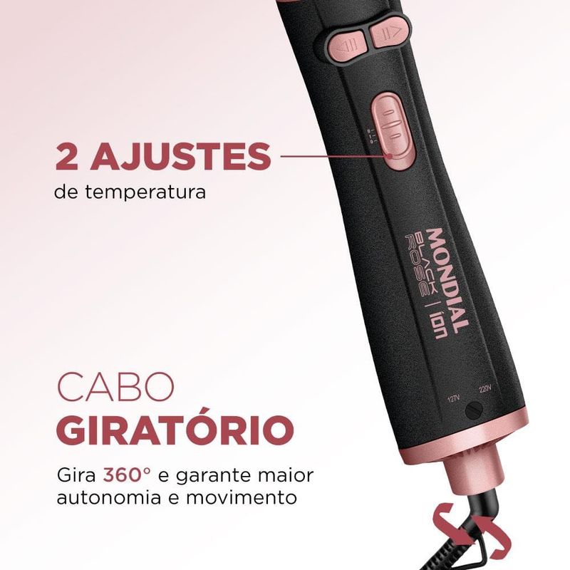Você busca um cabelo com resultado de salão sem sair de casa? E o melhor: com um produto prático e fácil de manusear! A Escova Rotativa Mondial Black Rose ERB-01 é a garantia de fios lisos, modelados e bem cuidados. Revestimento Cerâmico com TOURMALINE ÍON emite íons que selam a cutícula das mechas, eliminam aqueles incômodos fios arrepiados e proporcionam mais brilho e maciez. A Escova Rotativa tem 1200W de Potência: Potência de secador com a praticidade de uma escova; Com duplo sentido de rotação ela: Modela o cabelo para dentro ou para fora; 2 ajustes de temperatura e ar frio: Proporcionam melhor desempenho durante a modelagem; Você seca, alisa e modela o cabelo ao mesmo tempo. Muita praticidade com uma única mão.Super Fácil de usar: Selecione a temperatura desejada e escove os cabelos da raiz até as pontas acionando o botão de rotação para modelar; Secagem rápida com resultados de salão.