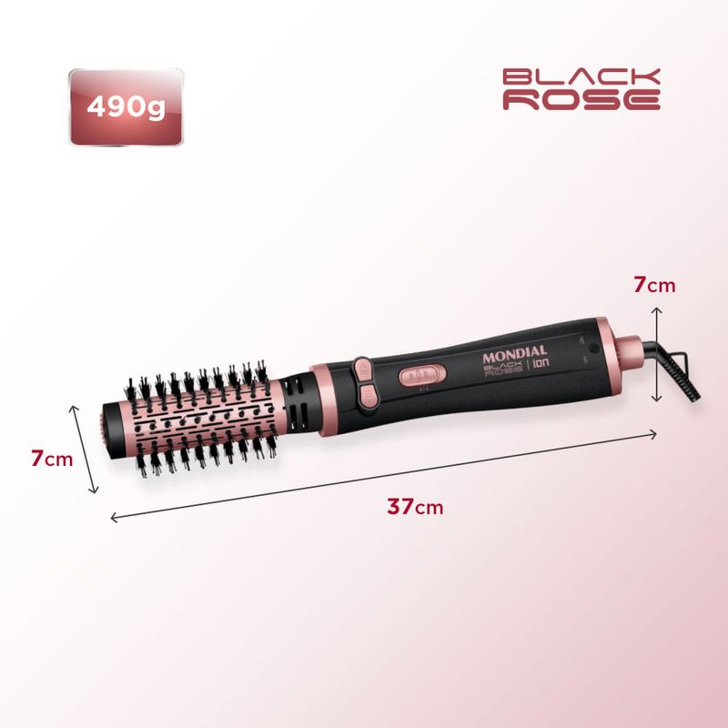 Escova Rotativa Mondial ERB-01 1200W Bivolt Black/Rose Transforme sua rotina de beleza com a Escova Rotativa Mondial ERB-01 Black/Rose. Com design sofisticado e tecnologia avançada, ela seca, alisa e modela os cabelos com facilidade, trazendo resultados dignos de salão sem sair de casa. Com 1.200W de potência e revestimento em cerâmica com Tourmaline Íon, a escova protege os fios enquanto modela. A emissão de íons negativos sela as cutículas, reduz o frizz e intensifica o brilho natural dos cabelos. Seu sistema rotativo motorizado com dupla rotação 360° permite modelar os fios para dentro ou para fora, garantindo finalizações versáteis e profissionais. A escova é 3 em 1: seca, alisa e modela com apenas uma mão, mesmo com os cabelos ainda úmidos. O cabo giratório e as cerdas mistas proporcionam conforto, praticidade e maior controle no manuseio. Ideal para todos os tipos de cabelo, com ajustes de temperatura e voltagem bivolt chaveada. Características e Diferenciais 3 em 1 – Seca, alisa e modela com eficiência e praticidade Tecnologia Cerâmica + Tourmaline Íon – Proteção dos fios, brilho intenso e menos frizz Escova rotativa motorizada 360° – Rotação dupla para modelagem interna e externa Alta potência (1200W) – Secagem rápida e eficiente Bivolt chaveado – Ajuste manual entre 127V e 220V 2 temperaturas – Controle de calor ideal para cada tipo de cabelo Cabo giratório 360° – Liberdade total de movimento Cerdas mistas – Alinhamento e modelagem perfeitos Precauções Utilize sempre em cabelos úmidos ou secos, nunca encharcados. Desligue da tomada após o uso e aguarde esfriar antes de guardar. Limpe regularmente as cerdas para manter o desempenho.