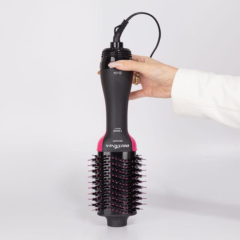 Para você que não abre mão de praticidade na hora de cuidar do seus cabelos, você precisa conhecer a Escova Secadora Britânia BEC02PR.Ela é 4 em 1, seca, alisa, modela e dá volume com rapidez e eficiência. Conta com 1300W de potência, 3 temperaturas e 2 velocidades que garantem alta performance e resultado de salão em instantes.O revestimento do tubo em cerâmica e as cerdas mistas com pontas emborrachadas da Escova Secadora Britânia promovem maior conforto e praticidade durante o uso, mantendo a hidratação dos cabelos. É bivolt e você pode levá-la para onde for, além de possuir cordão giratório 360° com 1,80m de comprimento para maior liberdade de usoTenha cabelos bem cuidados na hora que quiser com a Escova Secadora Britânia BEC02PR Bivolt 4 em 1 1300W.