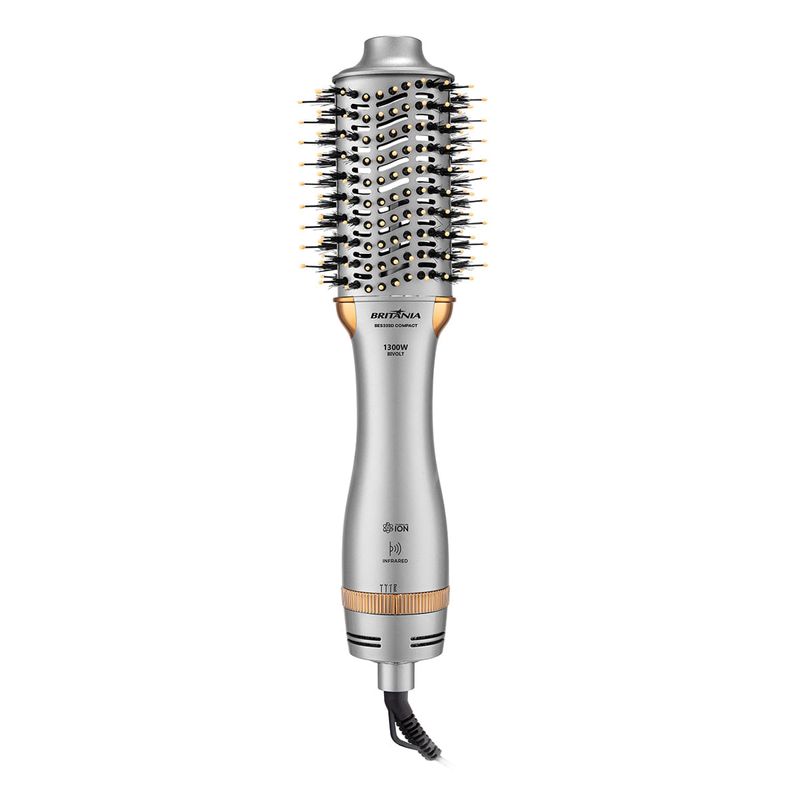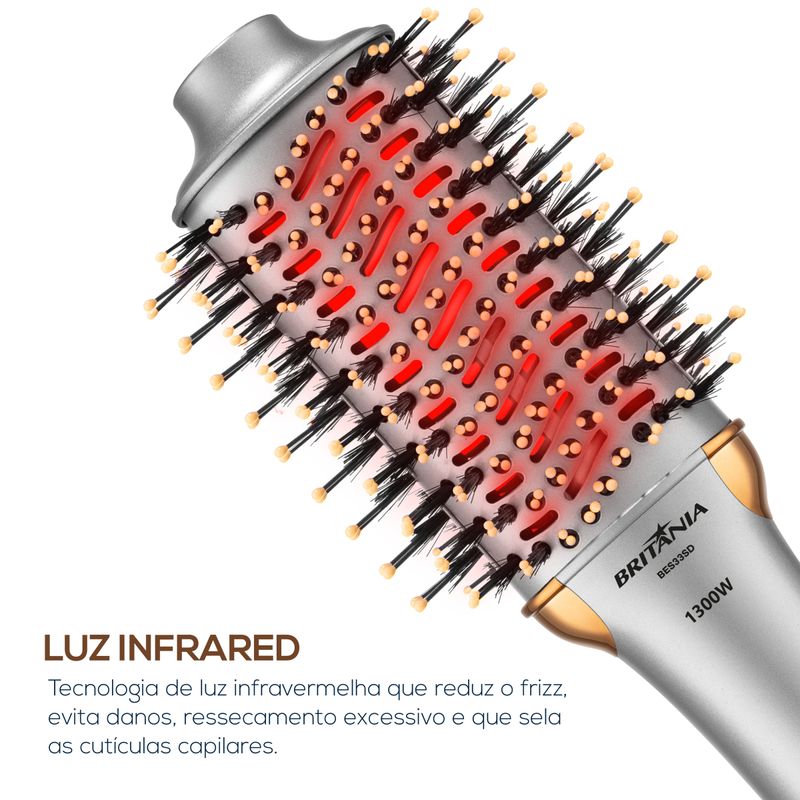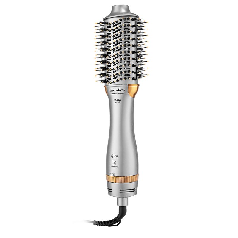 Escovas Secadoras Britânia: as mais queridas, secam de verdade! Cabelos bem modelados e cuidados da forma que você quer! A Escova Secadora Britânia Compact 4 em 1: seca, alisa, modela e dá volume aos seus cabelos com eficiência e perfeição. Possui Luz Infrared que seca a umidade diretamente do centro dos fios, evitando o ressecamento excessivo e selando as cutículas capilares. Além disso, a tecnologia Tourmaline Íon da Escova Secadora Britânia preserva a umidade natural dos fios, eliminando o frizz. Já o revestimento em Nanocerâmica evita o ressecamento e o atrito, protegendo os fios do calor e proporcionando brilho ao cabelo. Bivolt, com 1300W de potência e design compacto, ideal para modelagem das pontas, cabelos curtos e franjas, você leva a sua Escova Compact BES33SD para qualquer lugar e faz o penteado que mais gosta. E para inovar ainda mais, a Escova Secadora Britânia Compact BES33SD possui 3 temperaturas e 2 velocidades, assim, é possível fazer diferentes combinações de acordo com a sua necessidade. • Produto bivolt • 3 temperaturas • 2 velocidades • Cordão elétrico giratório • Tourmaline íon • Luz infrared • Tamanho compacto • Cordão elétrico com 1,80m.