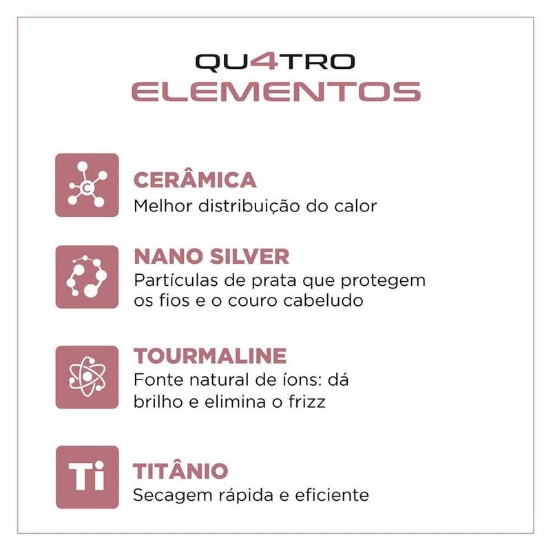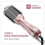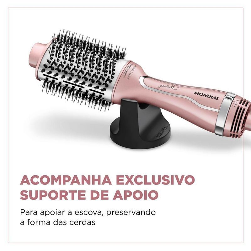 Escova Secadora By Juliette Mondial Golden Rose Bivolt ES-JU-01A Escova Secadora da Linha by Juliette Qu4tro Elementos traz um revestimento especial enriquecido com infusão de Cerâmica, Titânio, Tourmaline e Nano Silver. Esses 4 elementos, juntos, protegem seus fios e garantem uma aparência mais saudável aos cabelos, com brilho intenso, maciez e sem frizz. Saiba mais sobre a Escova Secadora ES-JU-01Revestimento especial com qu4tro elementos:- Cerâmica: Garante uma melhor distribuição do calor e contribui para uma secagem rápida e mais saudável.- Titânio: Tecnologia que age na umidade dos cabelos e reduz o tempo de secagem, além de eliminar o efeito frizz.- Tourmaline: Fonte natural de íons negativos, que eliminam o frizz e garantem mais brilho.- Nano Silver: Partículas de prata que ajudam a inibir a ação de bactérias, contribuindo para a proteção dos fios e do couro cabeludo.3 Em 1: Seca, Alisa E Modela: O poder do secador aliado à facilidade da escova. Você seca, escova e modela o cabelo ao mesmo tempo, com uma única mão.Potência 1200W: Alta potência para uma secagem rápida e eficiente.Bivolt: Pode ser utilizada em ambas voltagens: 127V e 220V. Basta ajustar a chave seletora e ter a liberdade para usar sua escova em qualquer lugar!Exclusivo suporte de apoio: Para apoiar a sua escova e ajudar a preservar a forma das cerdas.3 Níveis de temperatura: São 3 opções de ajuste para garantir o resultado que você deseja. CABO GIRATÓRIO DE 2,5 METROS: O cabo-plugue tem 2,5m de comprimento e gira 360°, garantindo mais autonomia de movimento.Design oval facilita a escovação: O design oval é um aliado na hora de alisar as mechas, pois proporciona maior tração nos fios com o movimento da escovação.Um ano de garantia Mondial: A Mondial é a escolha de milhões de consumidores. Mondial, a escolha inteligente!Especificações Técnicas:Modelo: ES-JU-01Cor: Golden RoseNúmero de velocidades: 3Funções: Seca, escova e modelaNíveis de temperaturas: 3Potência: 1200WEmite Íons: SimCabo giratório: SimControle de temperatura: SimVisor LCD: NãoVoltagem: BivoltPeso: 0,55 KgItens inclusos: 01 Escova Secadora; 01 Suporte para apoio e 01 Manual de InstruçõesGarantia: 1 Ano