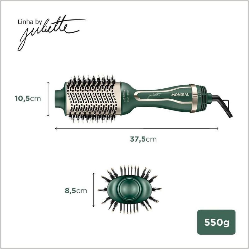 Escova Secadora Mondial By Juliette ES-JU-02 Verde Oliva 1300W BivoltEscova Secadora Mondial by Juliette 1300W Verde Oliva - ES-JU-02A Escova Secadora da Linha by Juliette Qu4tro Elementos traz um revestimento especial enriquecido com infusão de Cerâmica, Titânio, Tourmaline e Nano Silver. Juntos, esses 4 elementos protegem seus fios e garantem uma aparência mais saudável aos cabelos, com brilho intenso, maciez e sem frizz.Principais Características:Revestimento Especial Qu4tro Elementos: A fusão de Cerâmica, Titânio, Tourmaline e Nano Silver distribui o calor uniformemente, protege os fios, reduz o frizz e garante um cabelo com brilho e aparência saudável.3 em 1: Seca, Alisa e Modela: Combina o poder do secador com a praticidade da escova. Você seca, escova e modela o cabelo ao mesmo tempo, com uma única mão, de forma rápida e fácil.Alta Potência e 3 Temperaturas: Com 1300W de potência para uma secagem eficiente, possui 3 opções de ajuste para garantir o resultado que você deseja em diferentes tipos de cabelo.Design Inteligente e Prático: O design oval facilita a escovação e a modelagem. O cabo giratório de 2,5 metros garante mais liberdade de movimento, e a escova acompanha um suporte de apoio exclusivo para preservar as cerdas.Bivolt Chaveado: Ideal para levar em viagens, pode ser utilizada em ambas as voltagens (110V e 220V). Basta ajustar a chave seletora e usar sua escova em qualquer lugar.Especificações Técnicas:Marca: MondialModelo: by Juliette Qu4tro Elementos ES-JU-02Voltagem: Bivolt (com chave seletora)EAN: 7898578150127Tipo: Escova SecadoraPotência: 1300WNíveis de Temperatura/Velocidade: 3Cor: Verde OlivaPeso: 0,68 kgDimensões [AxLxP]: 38 x 11 x 9 cmGarantia: 12 meses